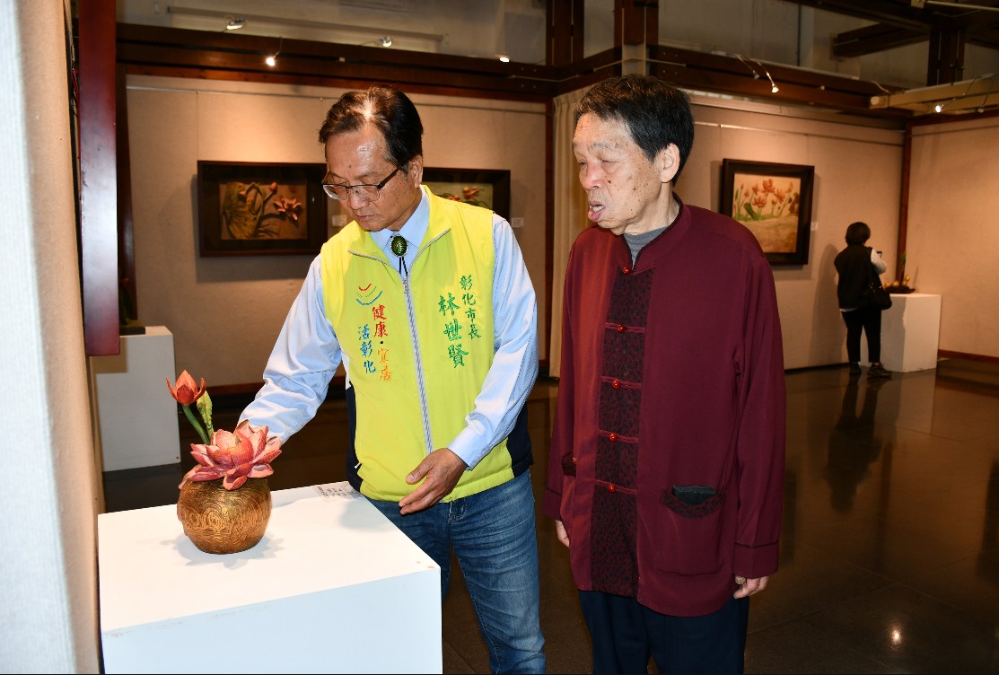 彰化藝術館自3月3日至3月22日舉辦「花深忘卻來時路~黃媽慶木雕展」,3月5日上午舉行開幕記者會。林世賢市長表示,本次展覽精選黃媽慶老師56件代表性作品,涵蓋立體、平面、圓雕、透雕、浮雕等多元創作形式,並結合著色與烤烙等技法,充分展現其深厚紮實的雕刻功力與藝術底蘊。展場整體氛圍以蓮花意象為主軸,營造沉靜雅緻的觀展空間,引領民眾體驗「蓮花不著水,日月不著空」的藝術境界。