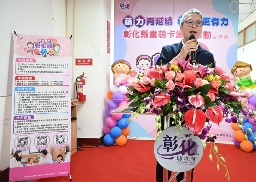 114年5月彰化縣政府推出全國首創的童萌卡,大獲好評。114年共計受理核發2萬1,076張童萌卡,核銷補助金額迄今約2億1,000萬元,民眾消費使用率高達98%。今(115)年延續辦理童萌卡,今(30)日上午於縣府6樓咖啡藝廊舉辦「彰化縣童萌卡續航啟動記者會」,由民政處長劉玉平代表彰化縣長王惠美與會,展現縣府以實際行動支持青年家庭的決心。
