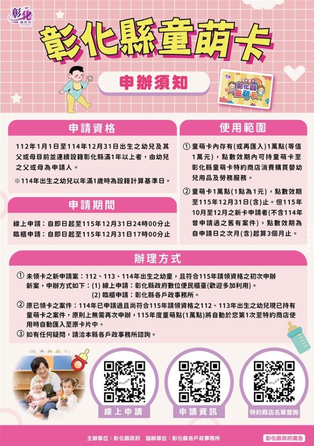 民政處表示,112年1月1日至114年12月31日出生幼兒,其父或母目前連續設籍彰化縣滿1年以上者,由幼兒之父或母為申請人,符合申辦資格者可領有1萬點(等值1萬元)的購物點數,預計逾2萬名彰化囡仔受惠。童萌卡點數除了可用於購買育兒用品與食品外,今年擴大新增幼童早期療育、幼兒休閒育樂與攝影等勞務服務項目,自115年4月1日起開放刷卡使用。