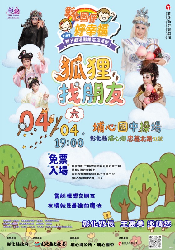 彰化縣文化局精心策劃,深受親子喜愛的「彰化囡仔好幸福—115年親子劇場鄉鎮巡演活動」於4月起熱鬧開演!4月3日下午3點在線西國小、4月4日晚上7點在埔心國中、4月6日下午3點在秀水高工接連登場,彰化縣長王惠美邀請您蒞臨觀賞,一同歡慶兒童節!