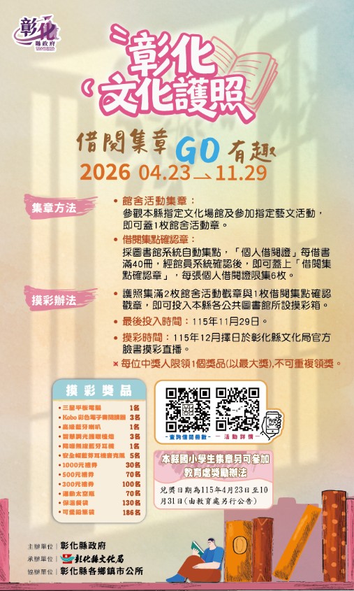 為持續提昇閱讀風氣,於4/23至11/29在全縣各公共圖書館辦理「2026彰化文化護照─借閱集章GO有趣」活動,活動採取集章摸彩方式,於圖書館索取護照之後,參觀文化館舍、參加藝文活動以及借閱圖書皆可集章,每張個人借閱證於護照集滿2枚館舍活動章,同時借書40冊獲蓋一枚借閱集點確認章即可參加摸彩,摸彩獎品包括高級平板、彩色電子書閱讀器、禮券等600個獎項。
