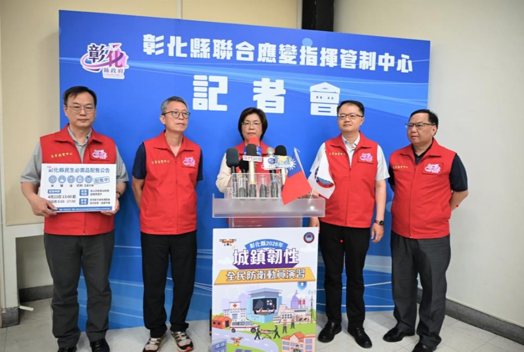 彰化縣政府配合國家「全社會防衛韌性」政策目標,結合「民力訓練暨運用」、「重要民生物資盤整暨配送」、「能源及關鍵基礎設施維運」、「社福醫療及避難設施整備」及「資通、運輸及金融網絡安全」等5大核心任務,於今(115)年4月22、23日辦理「彰化縣2026城鎮韌性(全民防衛動員)演習」。22日在彰化縣消防局實施兵棋推演,23日結合3處關鍵基礎設施(涵蓋醫療機構、重要資源設施及交通要道)與本縣選定各5處地點開設配售站、救濟站、急救站,以及4處防災協作中心、1處校園防空地點進行實作操演。由彰化縣長王惠美擔任彰化縣聯合應變指揮管制中心指揮官,率領縣府各局處、鄉鎮市公所,並邀請電力、電信、天然氣、自來水等公用事業單位、民間企業及非營利組織共同參與,藉以強化地方政府之戰時應變與防救災協調能力。