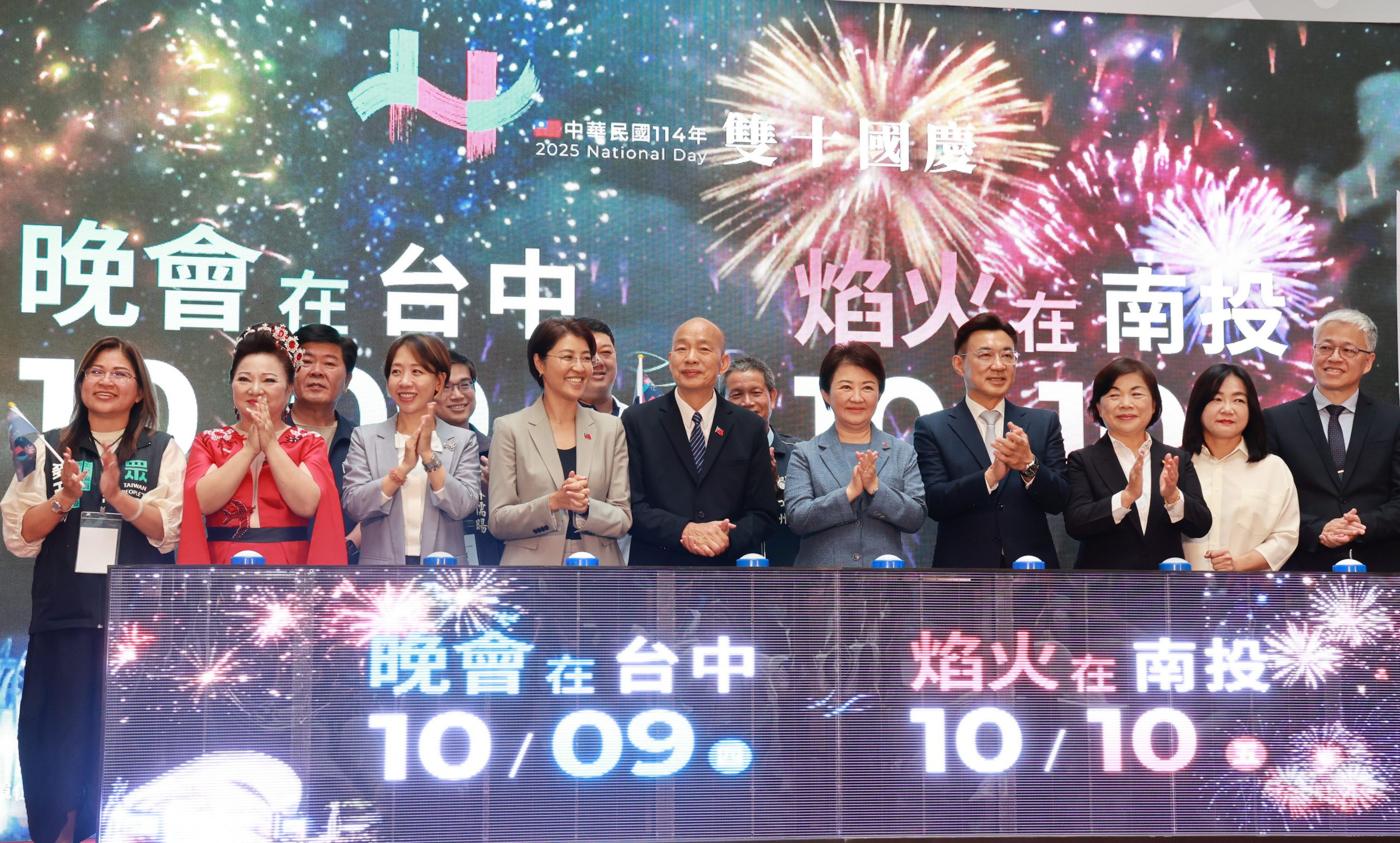 114年國慶晚會在台中、國慶焰火在南投。兼國慶籌備委員會主委的韓院長24日偕同立法院副院長江啟臣、南投縣許縣長、台中市盧市長等人,舉辦跨縣市的聯合記者會,包括立委馬文君、游顥、麥玉珍、楊瓊瓔,僑委會副委員長李妍慧等人參加。