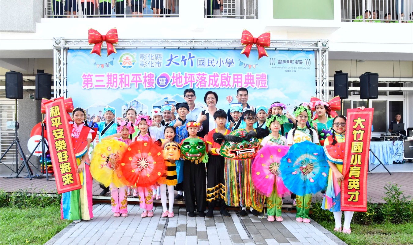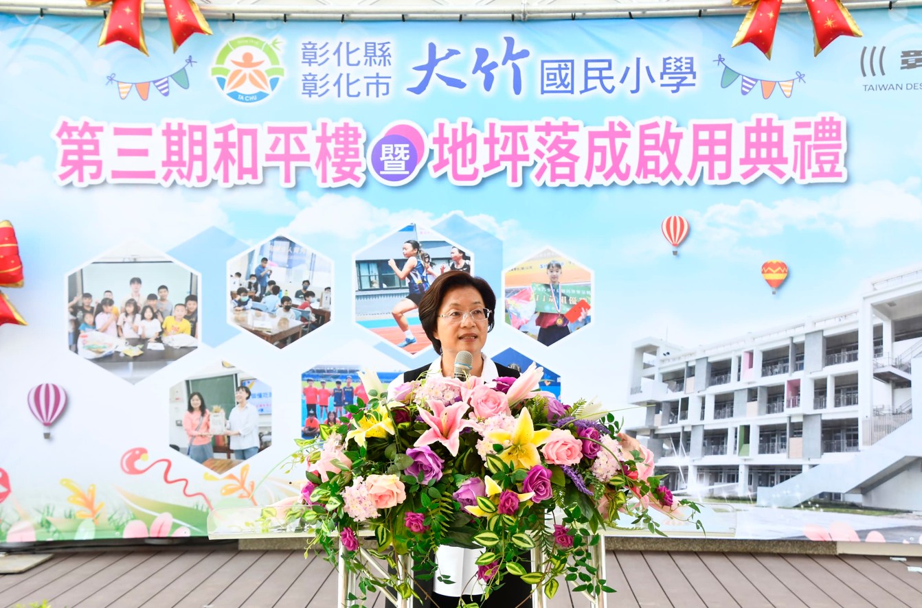 彰化縣政府25日上午在大竹國小辦理「第三期和平樓暨地坪落成啟用典禮」,彰化縣長王惠美、大竹國小校長黃馭寰與各級民代與會。王縣長表示,從她上任以來,大竹國小忠孝樓、仁愛樓到這次的和平樓的動土及剪綵,一路走來,見證大竹國小校舍改建完成的每一哩路,不僅和平樓獲得2025 年建築園冶獎,代表近年彰化縣尋求建築美感設計的重要成果,和平樓自民國69年啟用至今,歷經40餘年。由於建築結構逐漸老舊,牆面龜裂、樑柱鏽蝕,伴隨漏水與水電管線老化等問題,加上教室空間不足,長期超負荷使用,已對孩子的學習安全與品質造成影響,新校舍規劃17間教室,同步全面整修地坪,不僅提供師生安全、舒適的學習環境,也讓校園風貌煥然一新,打造全新的和平樓。