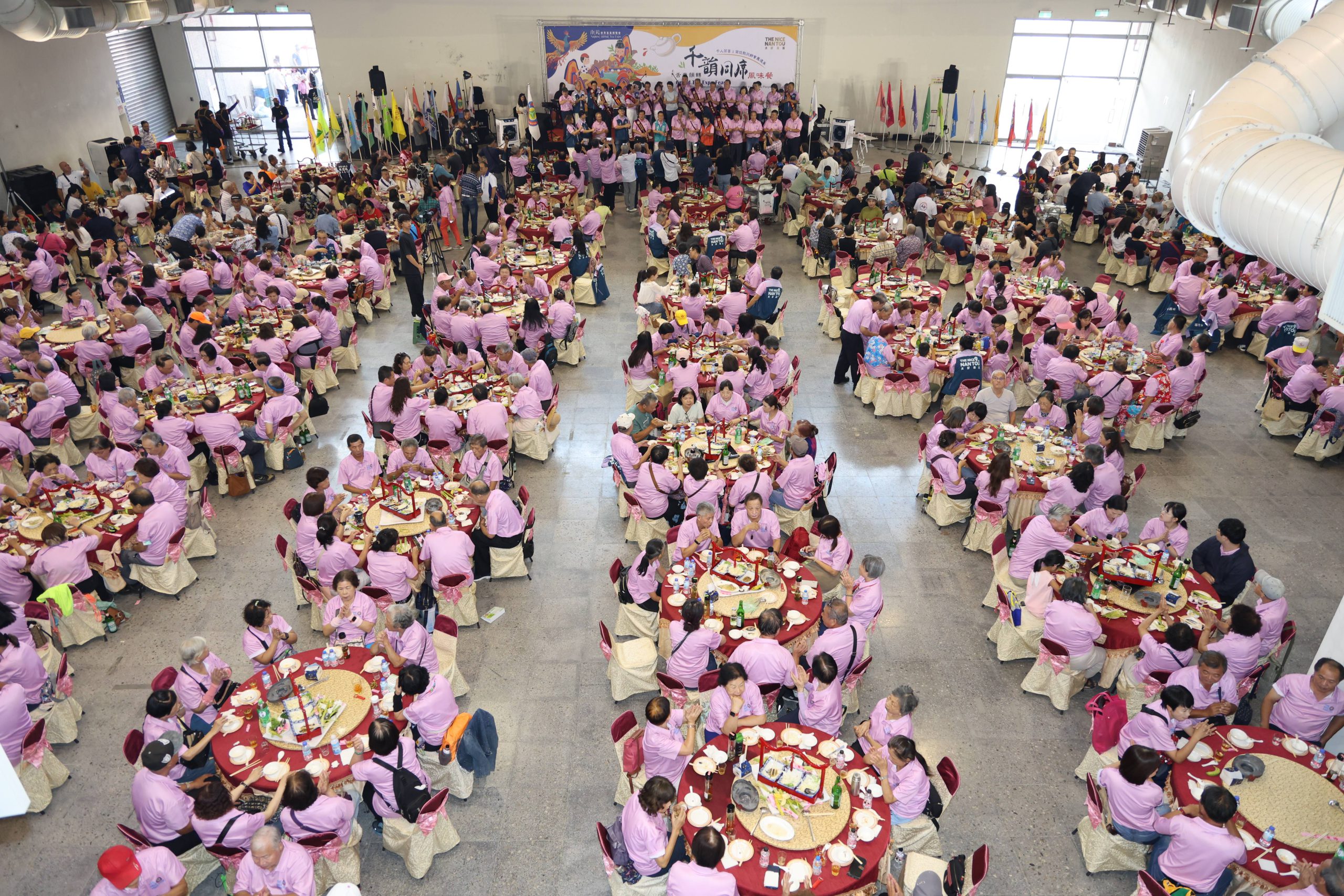 舌來韻轉、千韻同席「千人茶宴」共設計了茶韻南投迎賓珍、蟲草玉盅烏骨湯、玉露信義鱘龍鮮、 香糯蓮夢茶芋餅、蒜香銀絲蒸草蝦、金絲乳香干貝盞、唐韻御膳一品膀、松露百菇龍膽湯、魚池紅玉奶油餅九道以茶葉等南投農特產入菜的美味佳餚。
