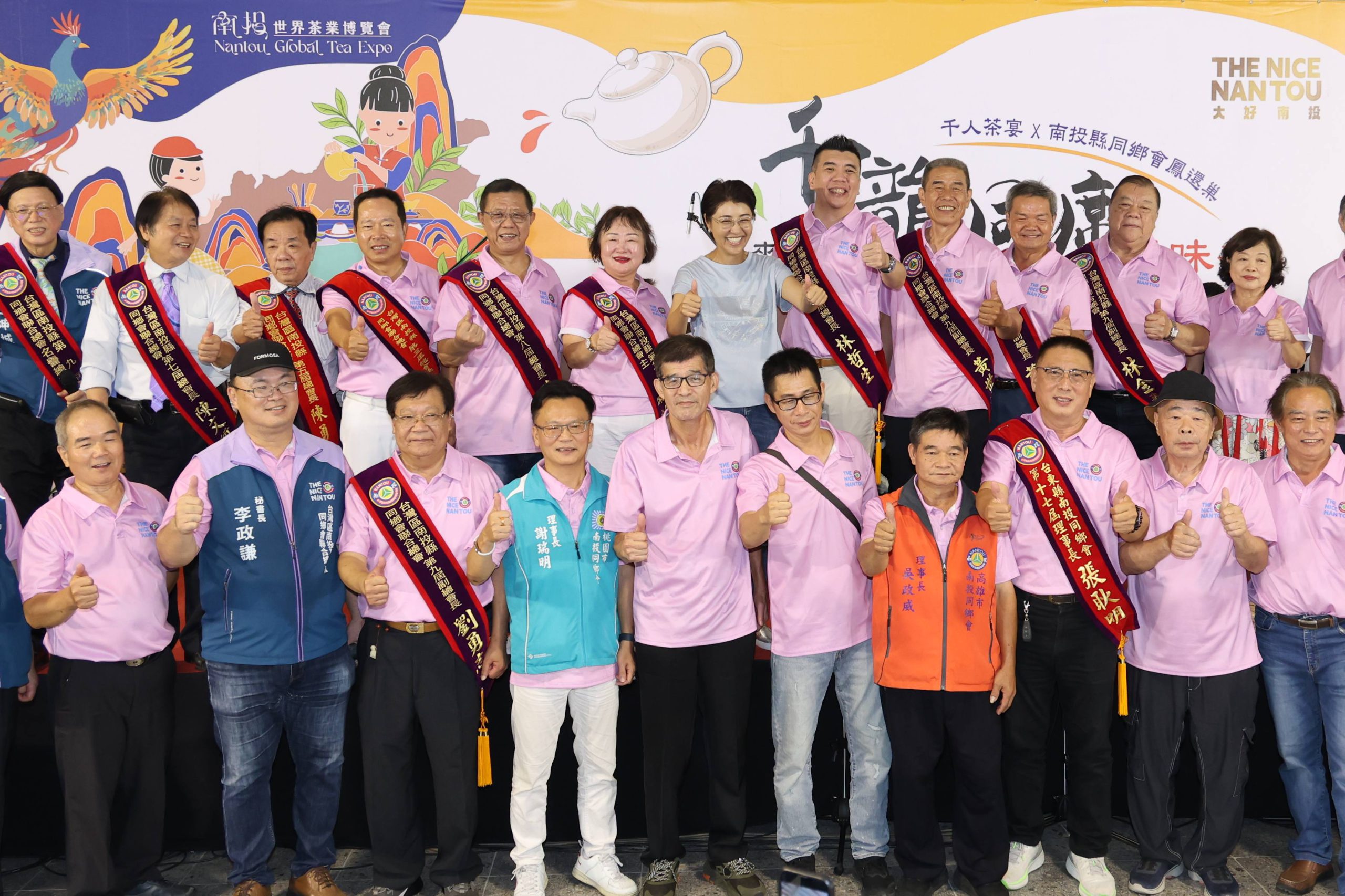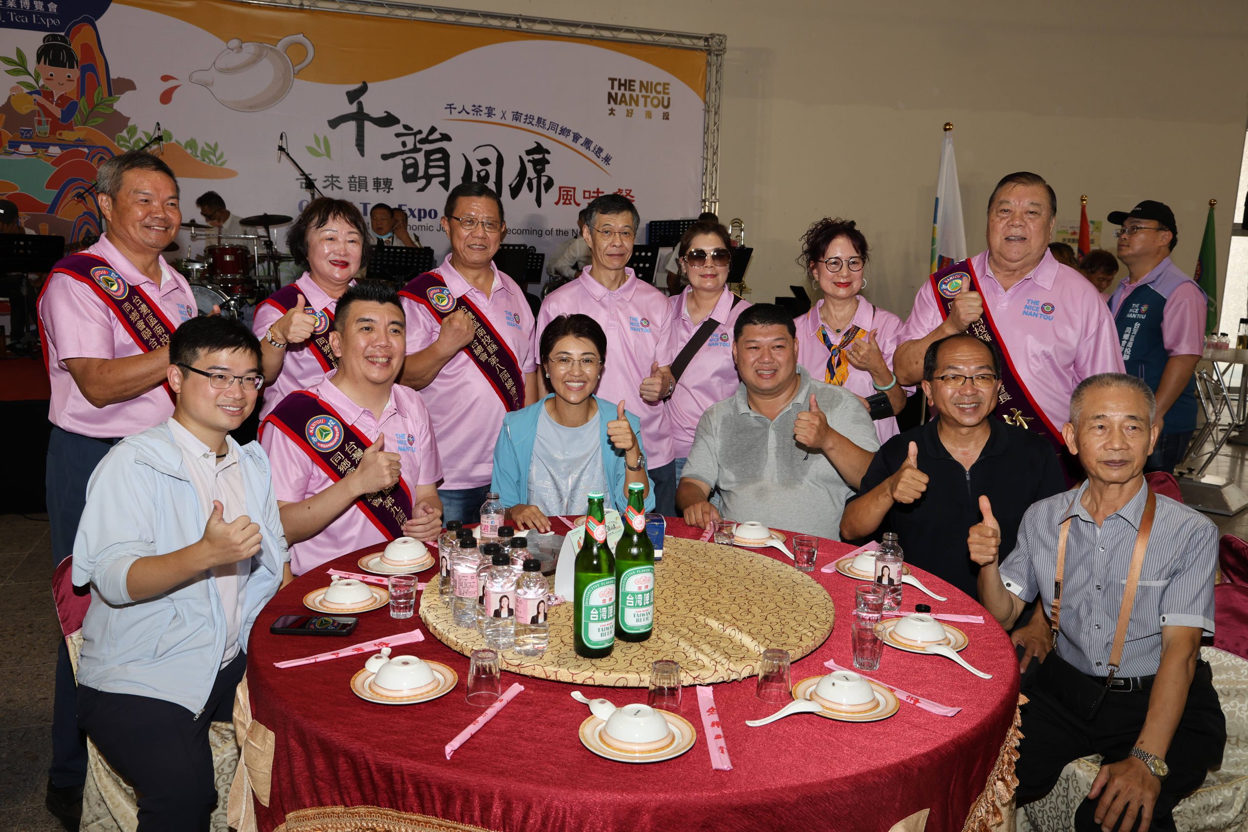 舌來韻轉、千韻同席「千人茶宴」除了1千位海內外16個分會的南投同鄉參加,也邀請全縣各鄉鎮市農會幹部一同出席,許縣長及副縣長王瑞德也率縣府各局處長踴躍參加,還有立委游顥及縣議員林儒暘等多位民代到場,共同為南投茶葉等相關農特產品擴大推廣行銷,許縣長特別致贈每位參加南投同鄉一盞「舌來韻轉」茶博杯,更不忘提醒大家,一定要逛遍茶博、採購豐收滿行囊,再結束這次返鄉行程,許縣長並和台灣區南投縣同鄉會聯合總會幹部及各縣市會理事長大合唱「回鄉的我」,為活動掀起高潮。