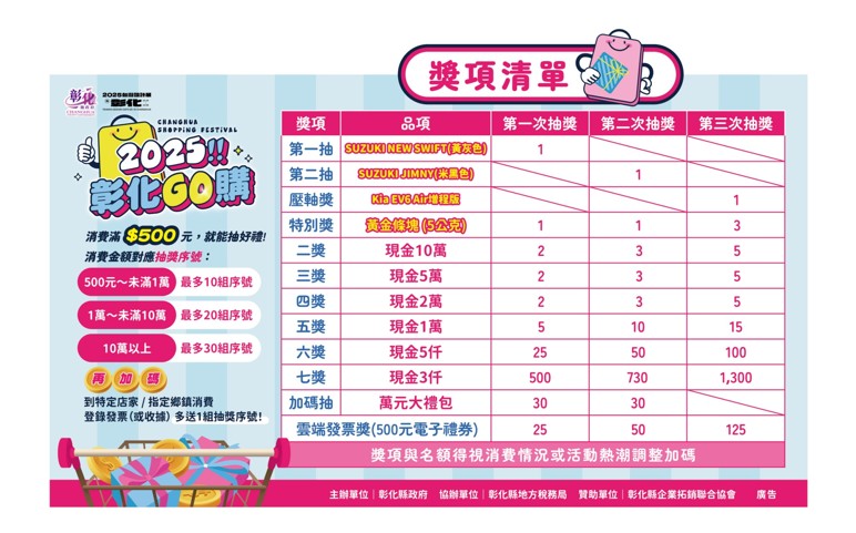 經濟暨綠能發展處表示,分享增加抽獎機率的小秘訣,第一步,在超過800家的特定消費店家,消費滿500元以上就有多一組抽獎序號,或在即將於彰化、鹿港、田尾及田中共3個展區正式開幕的台灣設計展的活動鄉鎮消費,也可額外多1組抽獎序號;第二步,綁定雲端發票載具(手機條碼),省時省力又有專屬獎!歡迎大家一起來彰化𨑨迌,消費購物,就有機會獎金好禮拿不完。