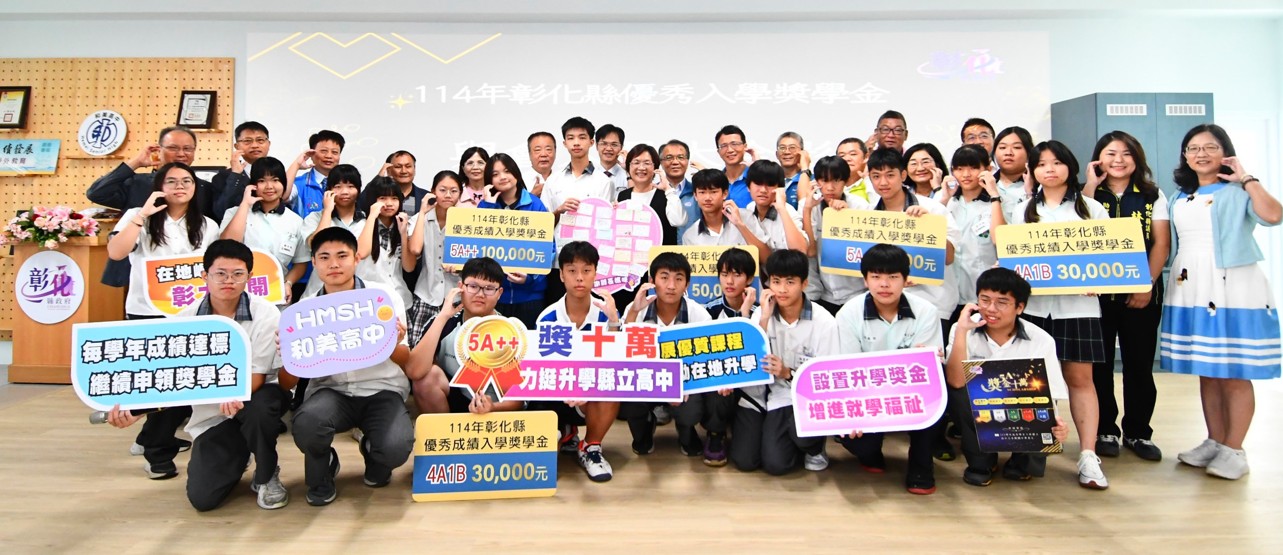 113學年度起,凡設籍彰化縣且為本縣國中畢業生,選擇到縣立高中就讀,依國中會考成績國、英、數、自、社五科達5A++、5A+、5A、4A1B、3A2B以上者,將分別發給入學獎學金十萬元、八萬元、五萬元、三萬元、二萬元。同時,鼓勵各位同學認真求學,未來每學年成績達年級前百分之十者,可持續申請獎學金,邁向心中理想的大學。
