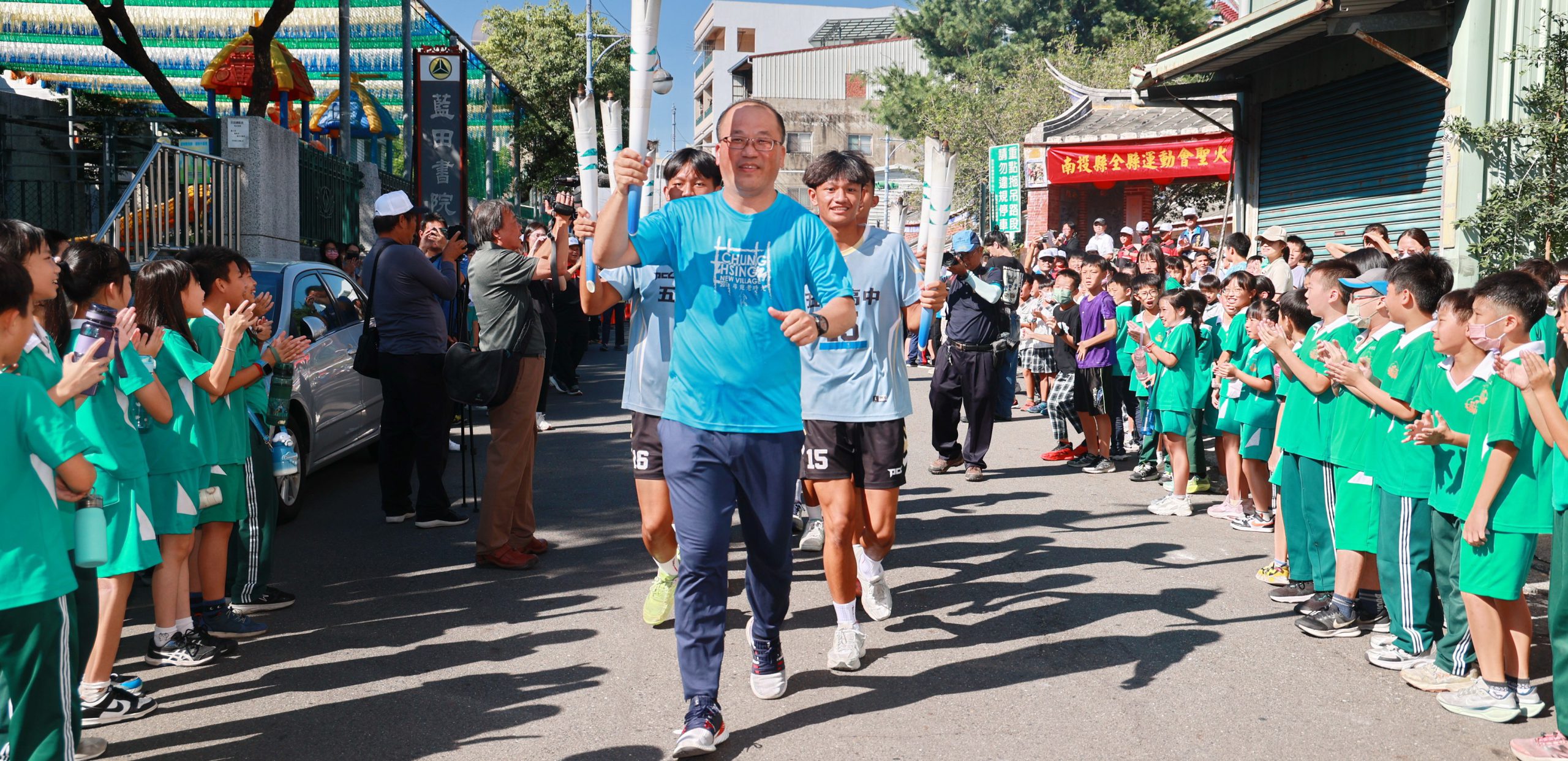 在書院主委張振昌引導下,王副縣長點燃聖火,再將聖火遞給縣府教育處長王淑玲,最後由五育中學聖火隊傳遞出去;聖火起跑,南投國小師生站在道路兩旁歡迎,學生歡呼,拍手叫好,場面熱絡。