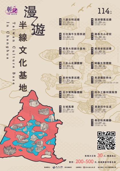 為串聯彰化縣內各文化基地與周邊社群,展現地方文化能量與生活美學,文化局將於11月15日至12月7日辦理15場次的「漫遊半線文化基地」走讀活動,並於即日起開放線上報名,邀請大家以漫步的節奏深入山、田、海、街之間,感受彰化豐富的文化紋理與生活樣貌。