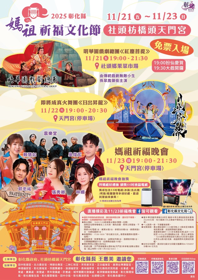 一年一度、全台信眾引頸期盼的「2025彰化縣媽祖祈福文化節」舞台表演秀,今年以「祈福、文化、藝術」為主軸,將於11月21日至23日在社頭鄉枋橋頭天門宮隆重登場!邀請「明華園戲劇總團」、「即將成真火舞團」及多位金曲歌手接力演出,融合傳統與創新藝術形式,連續三個夜晚,為彰化點亮信仰與祝福的夜空。