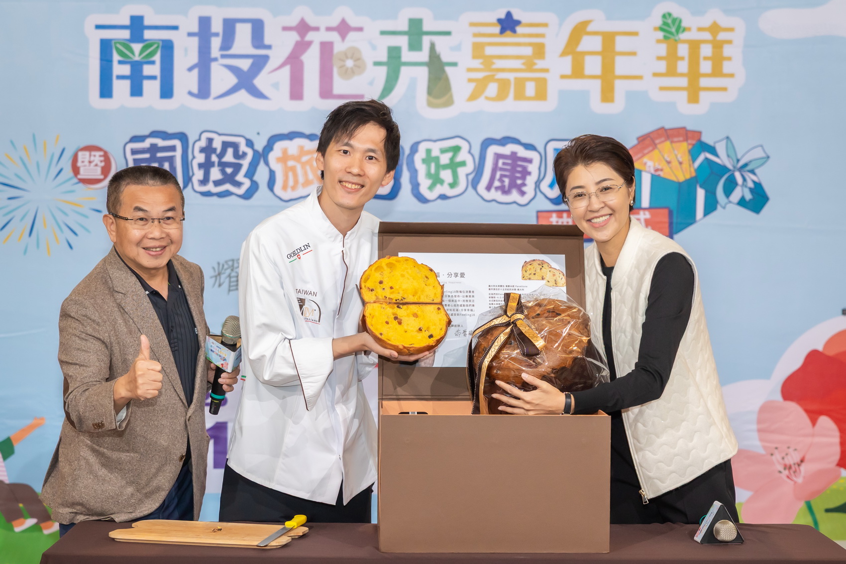 Feeling18創辦人茆晉(日牂)也在活動中,帶來台灣高鐵商務艙指定點心—可可椪柑蛋糕及台灣隊上個月在世界盃聖誕麵包大賽奪得總冠軍的水果麵包潘那朵尼,象以南投土地孕育的素材站上世界舞台,提升南投國際能見度。許縣長肯定Feeling18長期投入地方,以高品質烘焙結合在地花果香氣,讓花卉嘉年華增添更多精緻亮點。