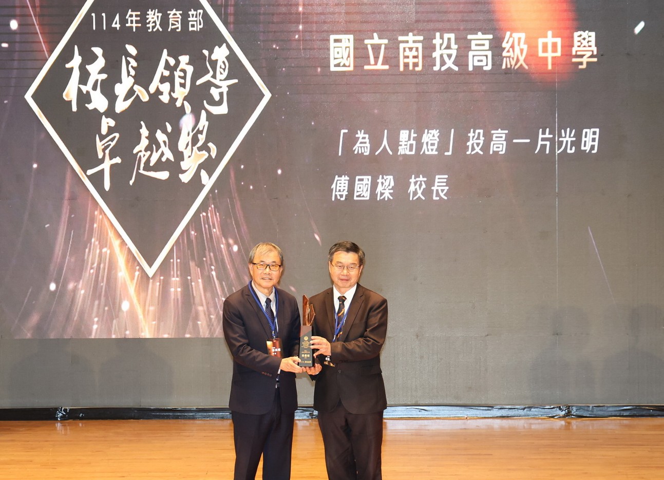 本次獲校長領導卓越獎的前國立南投高中傅國樑校長教育理念為「以人為本、多元適性、全人教育」,彰顯學習者主體性、獨特性、可塑性,每一位學生都是不一樣的獨特個體,各自擁有多元智慧與性向,「努力不是要超越別人,而是要成為更好的自己」。傅校長以「生而不有,為而不恃,長而不宰」思維,打造「適性揚才、成就每個學生的卓越優質高中」,落實教育政 策在各科教學領域及活動,推動「學術、技藝、體藝」金三角教育目標,讓學生都能適性發展。