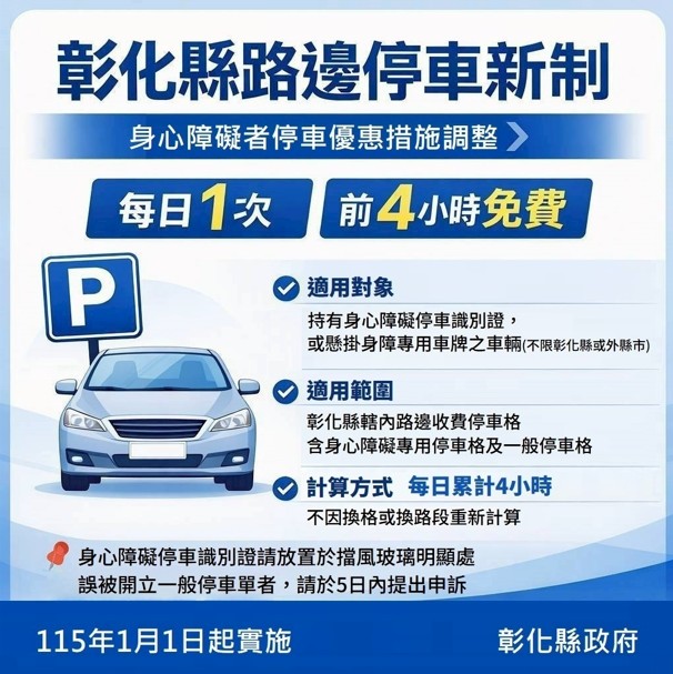 為讓身心障礙朋友在彰化出行更加輕鬆無礙,縣府帶來一份暖心的交通好消息,自115年1月1日起正式調整身障路邊停車優惠新制,凡停放於本縣路邊收費停車格的車輛,不論是停在身障專用格或一般停車格,每日第一次停車皆可享有「前4小時免費」的貼心優惠。