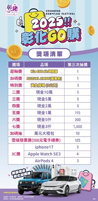 「2025彰化GO購」消費抽獎活動,今(7)日於縣府中庭舉辦第3次抽獎直播記者會,彰化縣長王惠美與會。在律師及縣府政風處全程見證下,公開抽出1,880位幸運得主,去年受惠於設計展盛況與中央普發現金一萬元的雙重利多,成功帶動全台民眾湧入彰化,消費熱度超乎預期,本次SUZUKI JIMNY汽車得主在和美加油600多元就幸運抽中,最大獎Kia EV6 Air增程版電動車得主則是購買Gogoro,為這場為期數月的消費拚經濟活動畫下圓滿句點。