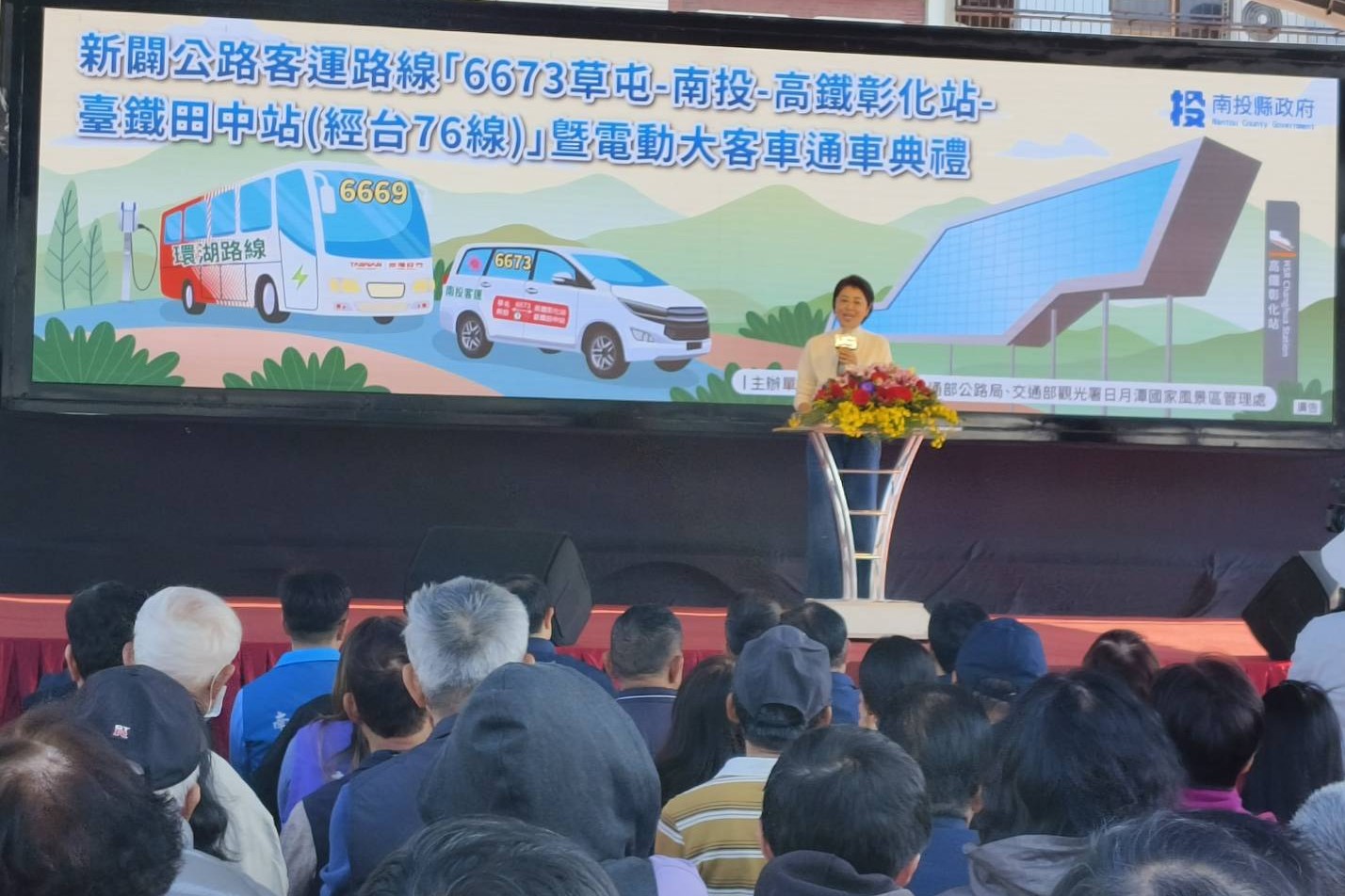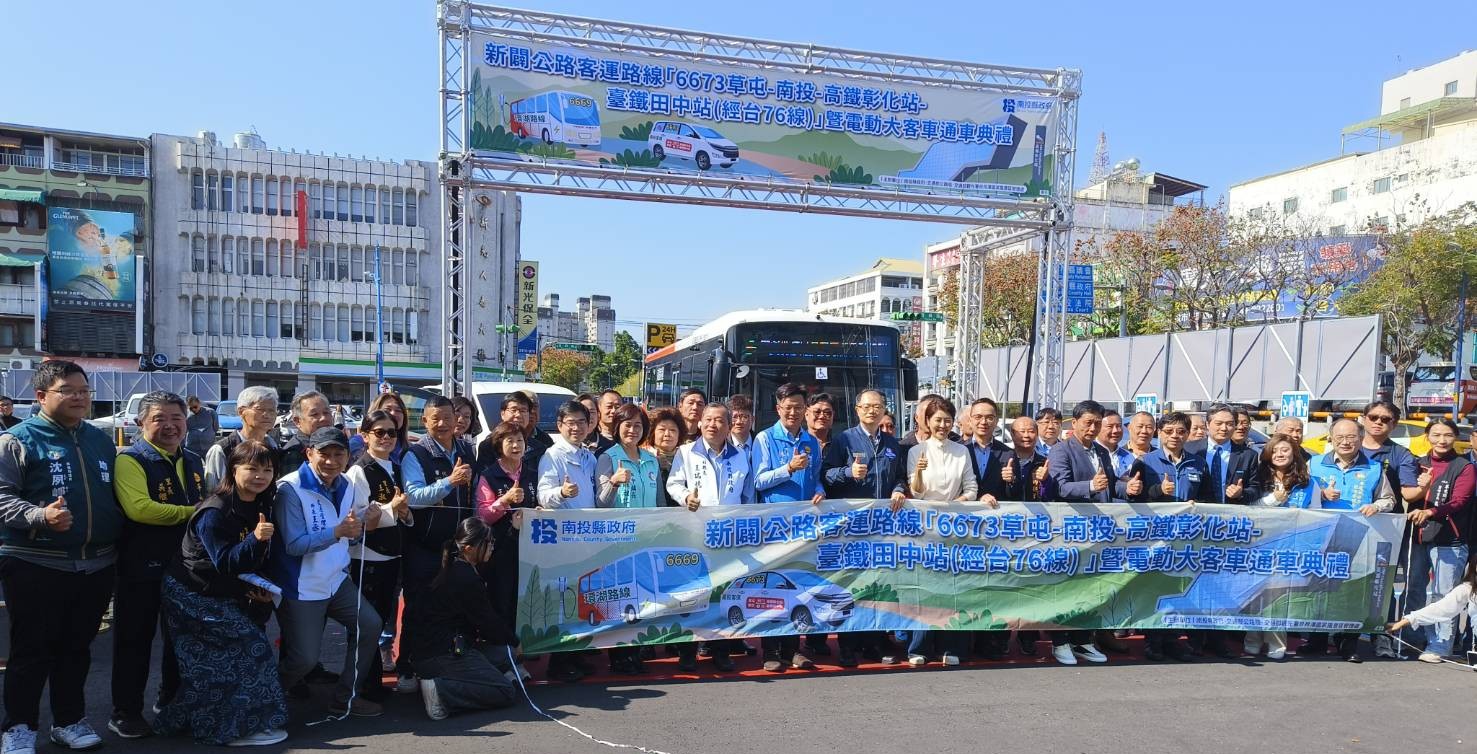為提升南投地區公共運輸便利性並推動永續旅遊發展,縣府20日在南投復興停車場(南投轉運站預定地)舉辦新闢公路客運路線「6673草屯-南投-高鐵彰化站-臺鐵田中站(經台76線八卦山隧道)」暨電動巴士通車典禮,新路線補上本縣南下客運長期不足的轉乘缺口,有效提升旅運效率,縣長許淑華與貴賓們共同剪綵啟用,展現南投在交通服務與低碳運輸的雙軸推動成果。