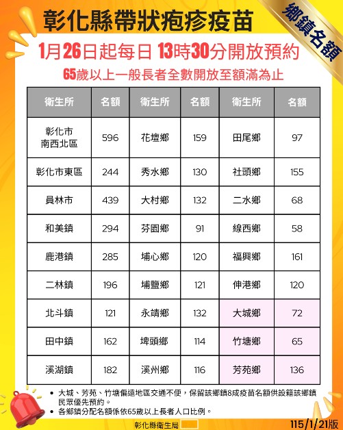 彰化縣推動帶狀疱疹(皮蛇)疫苗接種計畫開放首日民眾反應踴躍,第1期(1月20日至1月23日)接種名額於當日額滿,顯示長者對疫苗接種需求相當熱絡,施打意願遠超過預期。因接種踴躍,自1月26日起帶狀疱疹(皮蛇)疫苗全數開放預約登記至額滿為止。考量近期氣溫驟降,為維護長者健康,預約時間改為每日下午1時30分開始發放號碼牌,請65歲以上長者用餐完再前往衛生所預約。各鄉鎮一般長者疫苗接種分配名額如附件共4,567人,另考量大城、芳苑、竹塘偏遠地區交通不便,保留該鄉鎮8成疫苗名額供設籍該鄉鎮民眾優先預約。如現場預約額滿,由衛生所現場登記候補名額,若後續低收及中低收入戶長者未施打疫苗釋出,將優先通知候補民眾。