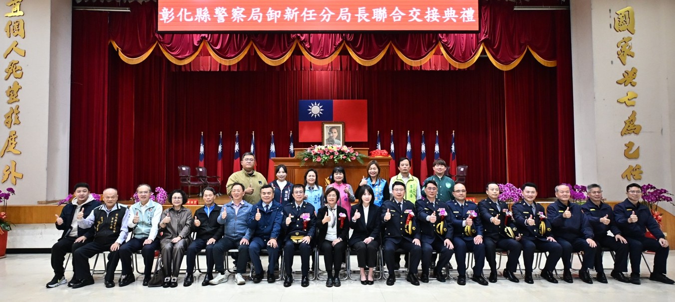 彰化縣警察局於今(26)日下午1時在警察局6樓禮堂舉行彰化、鹿港、溪湖及芳苑分局卸、新任分局長聯合交接典禮,會中由彰化縣長王惠美致詞勉勵,各級民意代表及各界貴賓到場共襄盛舉。
