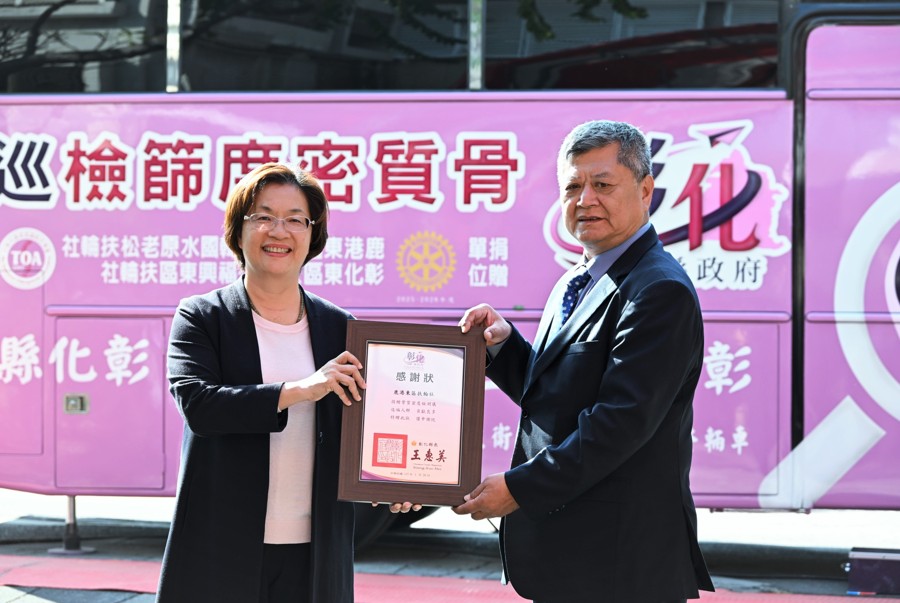 王縣長表示,感謝鹿港東區扶輪社、彰化東區扶輪社、福興東區扶輪社及韓國水原老松扶輪社長期與縣府合作,從過去的C肝根除、眼科外展服務巡迴車及儀器設備捐贈,到本次的骨質密度檢測車捐贈,協助偏鄉民眾,藉由骨質密度巡迴篩檢進行檢測,鹿港東區扶輪社跟福興東區扶輪社也持續挹注本縣經費超過50萬美元(超過新台幣1,500萬元)。這台骨質密度檢測車能深入偏鄉村里服務長者,讓長者得知骨密現況,進一步透過飲食、運動、曬太陽,讓骨本更穩固、獲得更好的照護。
