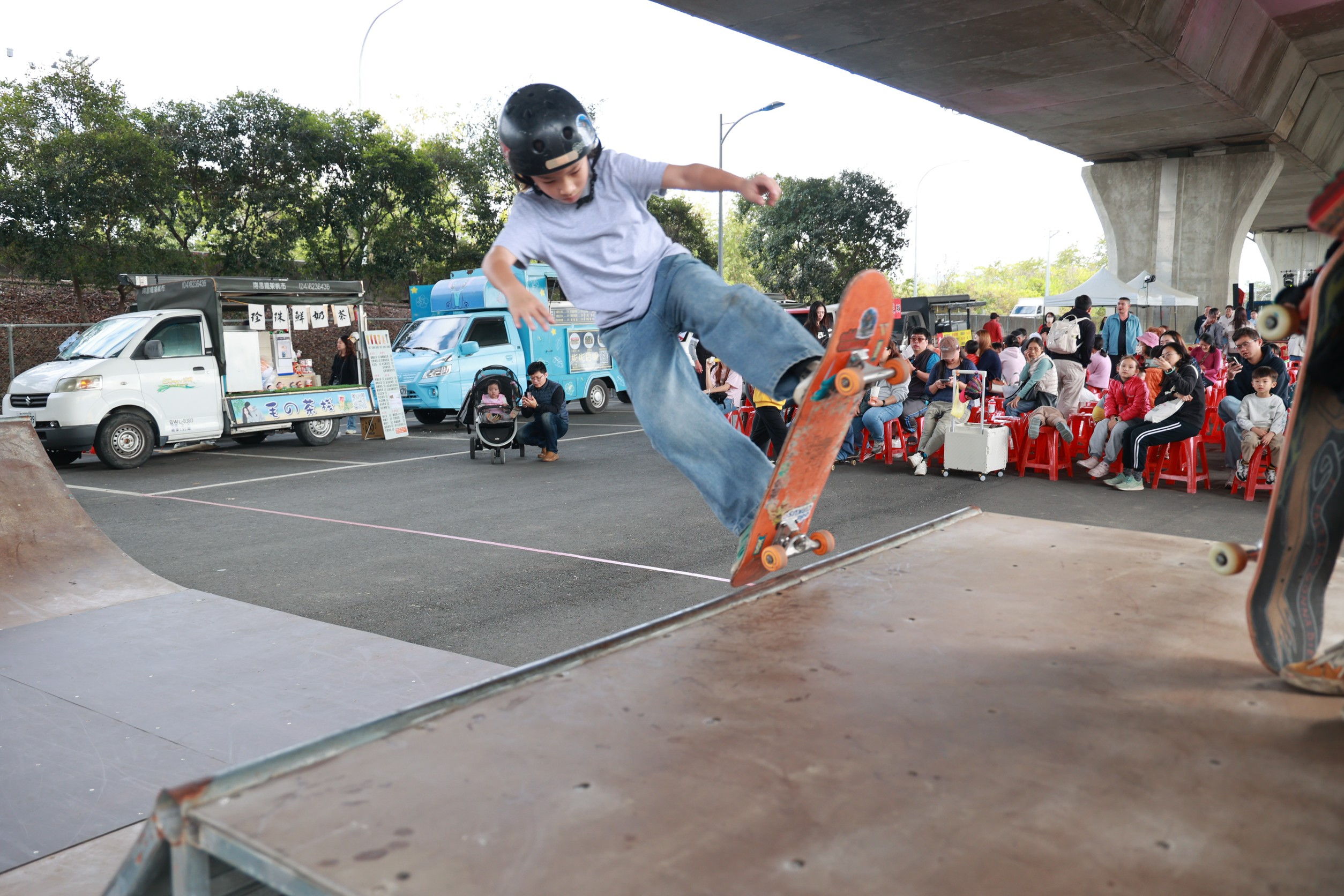 南投市國道三號高架橋下,1月31日下午變成熱血沸騰的「城市律動」派對!南投縣政府與市公所聯手舉辦「親子輪動場」動工前暖身活動,結合胖卡市集、滑板國手示範賽與嘻哈電音狂歡,不僅宣告這座投資6000萬元的親子運動公園即將動工,更點燃民眾對全齡宜居城市的期待。現場DJ節奏轟鳴、饒舌歌手熱唱,搭配滑板飛躍波浪道,原本閒置的橋下空間瞬間充滿活力,吸引上百親子家庭前來體驗「輪動」魅力。