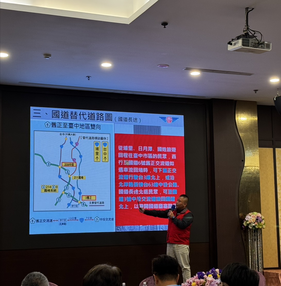 115年春節連假長達9天(自2月14日起至2月22日),南投地區預計湧入大量返鄉及觀光車潮。公路局中區養護工程分局今日(2月4日)舉辦「南投地區春節疏運記者會」,邀請在地媒體記者朋友,參與及瞭解南投地區「易壅塞路段之疏導」、「國道易壅塞路段之疏運」及「用路人交通資訊」,並特別針對清境、日月潭、草坪頭櫻花季及紫南宮等熱點,說明「避堵時段」與「替代道路指引」,呼籲用路人提前規劃,避開塞車尖峰。連假期間請用路人耐心駕駛,並遵守警察機關之機動導引,共同維護行車安全與順暢。