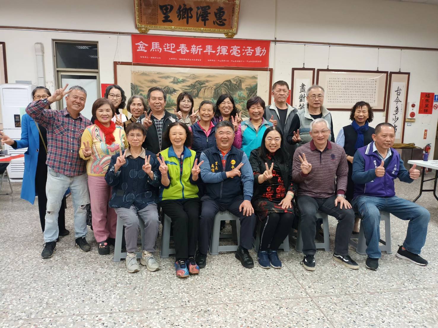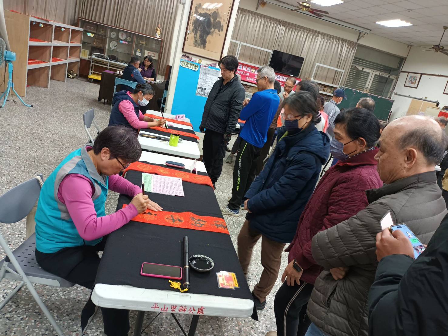 吳里長邀請縣內知名書法藝術家柯智美、林進發、陳秋衛、許建中、洪秀媛、洪毓秀、洪素禎、陳美玲、廖秀華和廖麗吟等蒞臨平山春聯里活動中心現場揮毫。