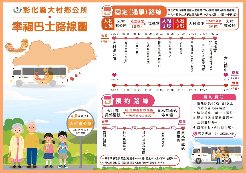大村鄉幸福巴士路線規劃定班定線及預約路線兩種,定班定線為照顧學生上下學,平日沿大村鄉公所、大崙二巷、五通宮香客大樓、新興社區活動中心、全家大溪店、大村郵局、茄苳社區、福進宮、大村國中等,總行駛路線長度約13公里,保障學生通學安全。預約路線則為提供長者們方便就醫、採買之交通需求,透過幸福巴士接駁至員郭醫院、員林基督教醫院、員生醫院及員林華成市場,當地有需求的民眾可透過平日以電話方式預約,享受巴士接駁服務。