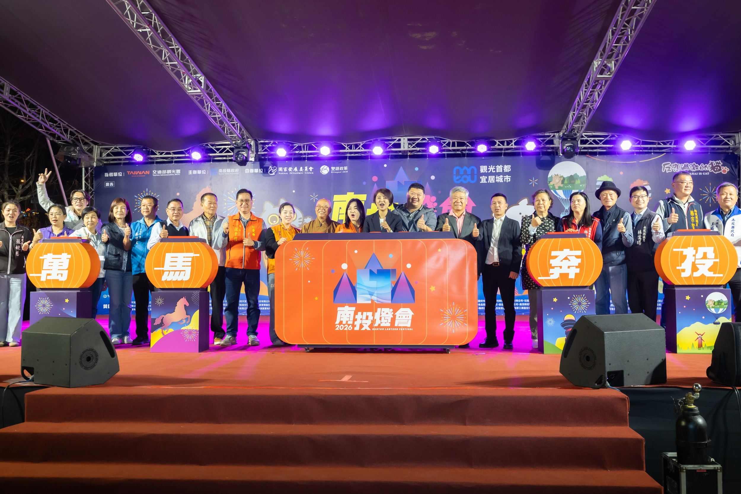 包括許縣長、立委馬文君、游顥,縣議員林儒晹、張秀枝、唐曉棻、蔡孟娥、簡千翔、宋懷琳、林憶如、張婉慈、蔡宗智,以及集集鎮長吳大村、國姓鄉長邱美玲、仁愛鄉長江子信等貴賓,一起揭開燈會序幕,正式點亮雙主燈,現場掌聲雷動。