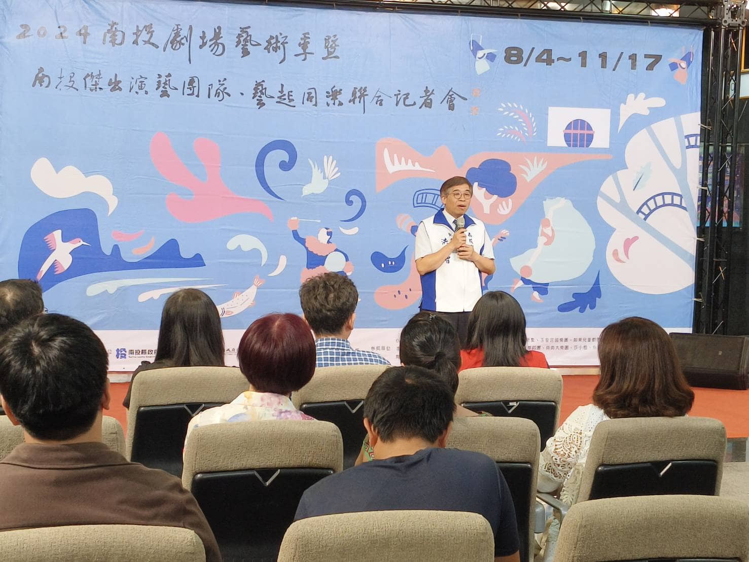 南投縣政府文化局10日在縣府中庭宣告「2024南投劇場藝術季暨南投傑出演藝團隊、藝起同樂」,將於 8月初旬起在各地精彩演出,縣長許淑華、秘書長洪瑞智、文化局長林榮森先後邀請民眾一起來參與。
