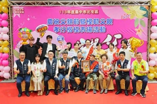 台中市北屯區公所(13)日舉辦「113年度台中市慶祝模範父親暨孝行楷模表揚活動」,54位模範父親及28位孝行楷模在親朋好友陪同下出席受獎合影,感受無比光榮的一刻,其中東山里邱姓一家父母、兒子榮膺模範父母親及孝行楷模,堪稱孝親楷模家庭,獲獎備受矚目。市府民政局長吳世瑋代表市長盧秀燕出席頒發「宏揚父德」及「孝行可風」獎牌,感謝每位爸爸對家庭的辛苦付出,並預祝所有辛苦的爸爸「父親節快樂」!