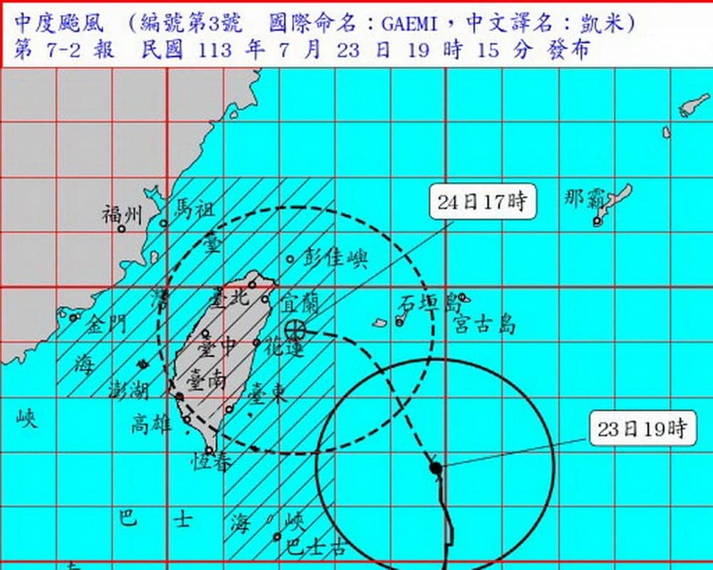 王副縣長表示,依據美國全球模式(GFS)雨量預測,這次凱米颱風預計會在24日8時起,從南投縣東部山區的仁愛及信義鄉等地,開始出現間歇性降雨,24日中午過後,降雨轉為遍及全縣,雨勢並在傍晚後逐漸增強,24日入夜到25日中午間的雨勢會最大,並至少持續到26日清晨,特別提醒縣民注意防颱。