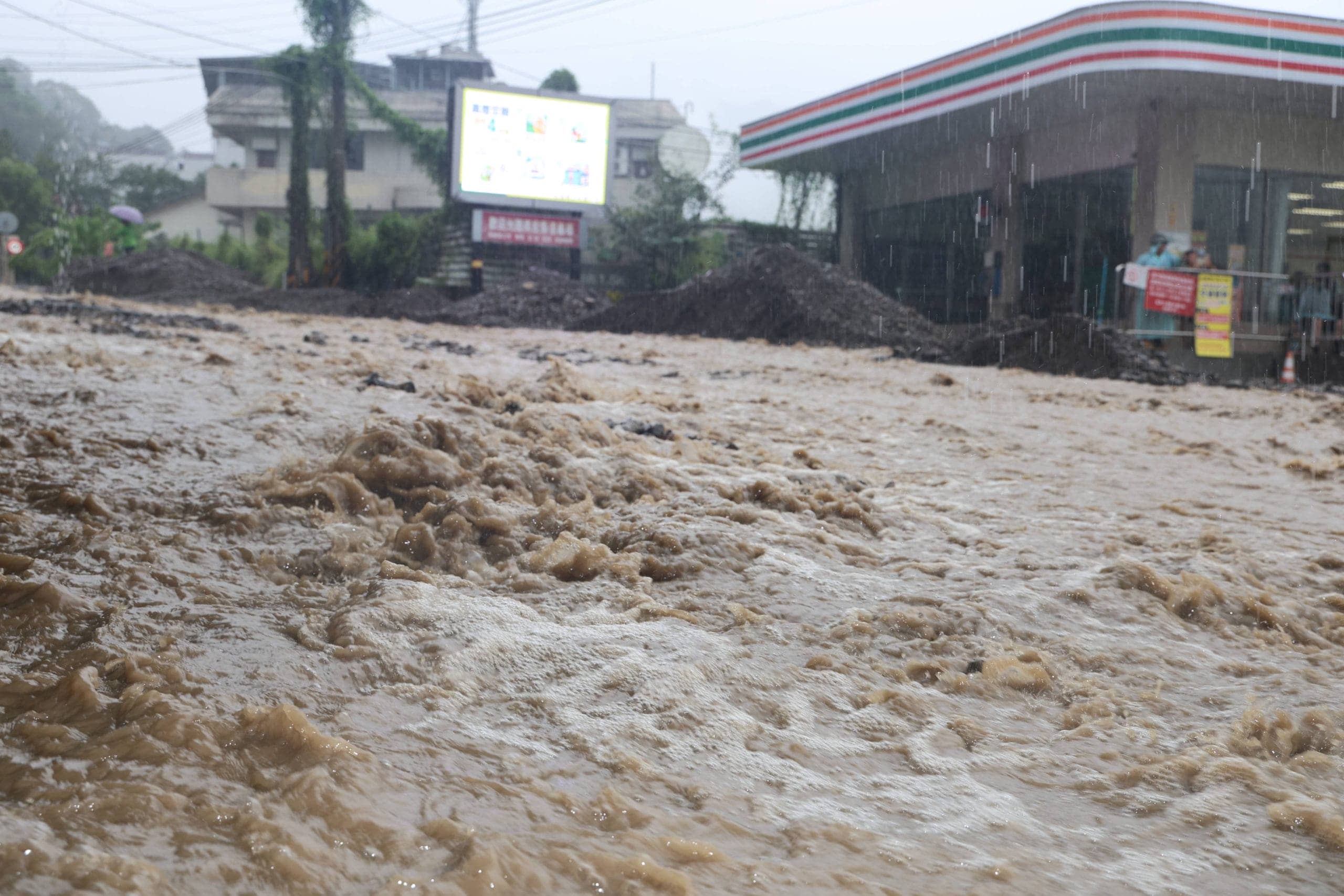 許縣長一早直驅災情嚴重的信義鄉,沿著台21線新中橫公路不斷碰到樹倒、土石阻路及積水深近一個輪胎的險況,不過仍順利挺進遭土石泥流阻斷的信義鄉明德村中油加油站附近,許縣長先隨同鄉長全志堅及村長吳瑞龍會勘已遭嚴重沖毀的陳友蘭溪砂石車便道,特別叮嚀務必加速提報災害復建工程並嚴防溪洪持續沖刷便道旁的堤防,避免造成更大的災情。