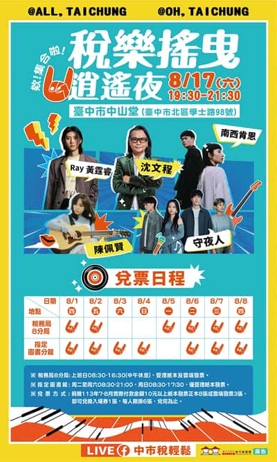 地稅局長沈政安表示,「稅樂搖曳 逍遙夜」將於8月17日晚間7時30分在中山堂熱鬧開唱,演出嘉賓陣容強大,跨越世代聯合演唱,除了出道逾40年的「雙金歌王」沈文程外,Ray黃霆睿、陳佩賢、南西肯恩、守夜人等皆是年輕人心目中的實力派偶像。現場還有抽獎好康,獎品有黃金墜飾、空氣清淨機、西堤雙人餐券、藍芽音箱、全聯禮券500元等大獎;當天如無法親臨現場,地稅局「中市稅輕鬆」臉書粉專將提供線上Live直播,也有機會抽中全聯禮券600元。