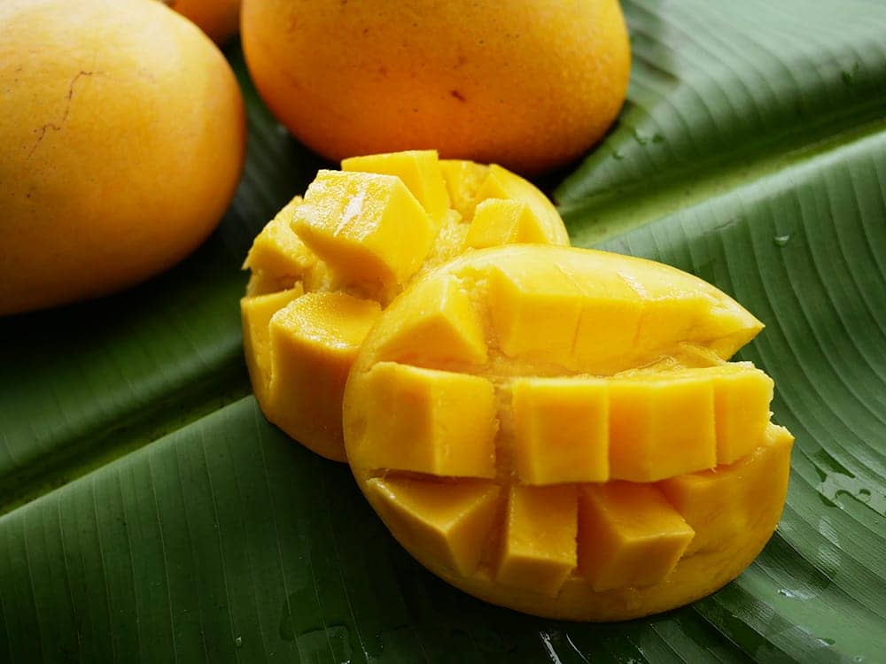 臺中農改場指出,金蜜芒果在彰化縣以埔心鄉、溪湖鎮、大村鄉及社頭鄉為主要產區,栽培面積約30至40公頃,採收期為6月下旬至8月中旬。該品種係由彰化縣張金泉先生的親屬於二戰期間於菲律賓將果實帶回臺灣後種植,經選育後命名為‘金蜜21’。金蜜芒果果皮金黃、果形圓形、糖度可達21度,果肉細嫩且水分飽滿,帶有蜜香。惟金蜜芒果於果實採收中後期(7月20日之後),容易發生晚熟果種子提早萌芽直接穿出果肉、果肉內側出現白色或褐色壞疽斑塊組織、果梗端果肉斷梗、果底處果肉過熟腐敗、果皮出現紫黑色斑塊等生理障礙情形,需由行株距、修剪時期及鈣硼適時葉面施用等操作策略調整,降低果實生理障害發生率。金蜜芒果屬管理難度較高的芒果品種,該場提醒農友需導入多項栽培管理技術,才能有效改善果實生理障礙及隔年結果的發生,以維持金蜜芒果產量與品質。