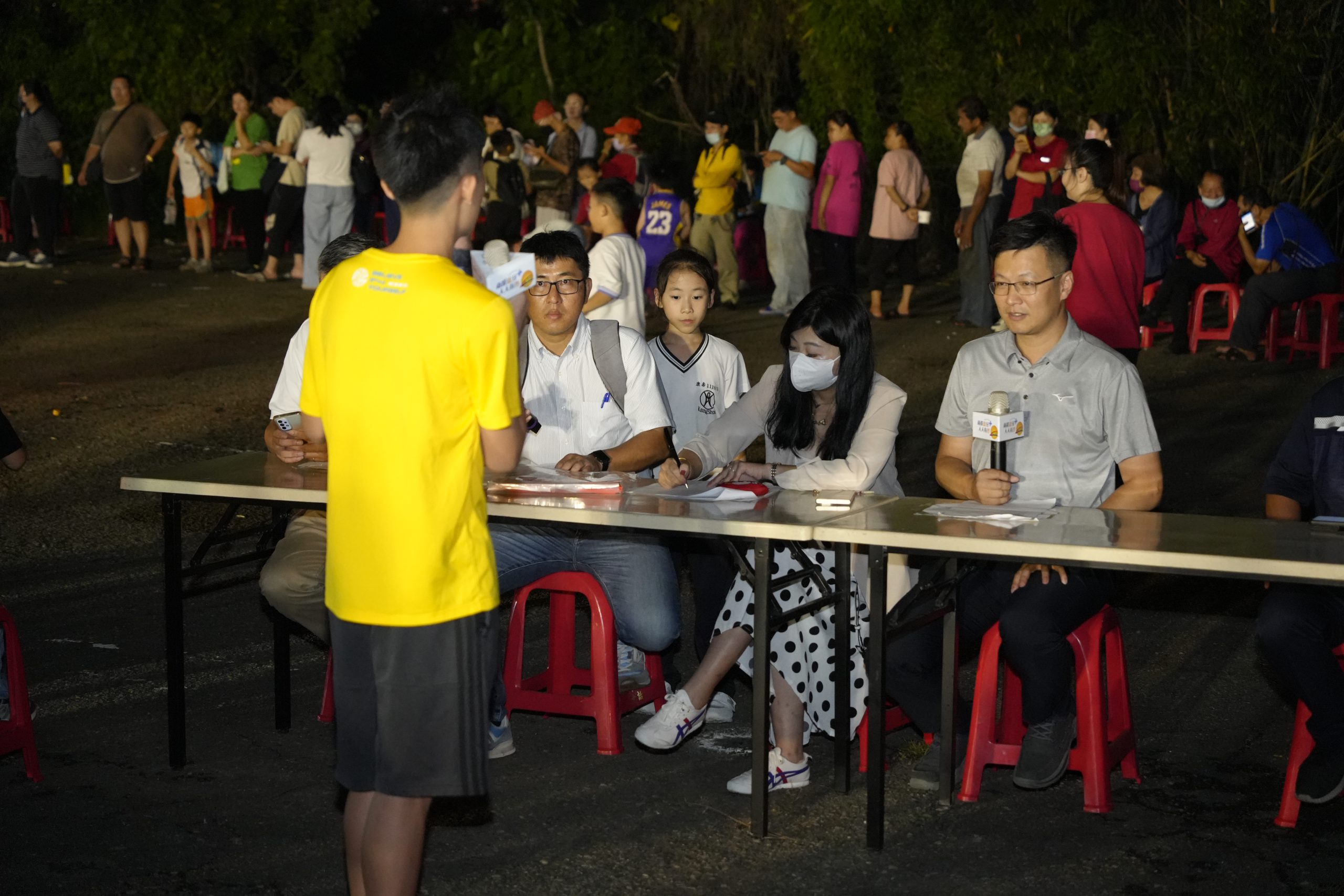 為了歡度涼爽秋季夜晚!市長張嘉哲(右一)與市長夫人共同舉辦營火派對,臨時推出「市政有獎徵答」項目,讓市民家人能延續中秋節的歡樂感,再次團聚一起。[記者梁添義攝]