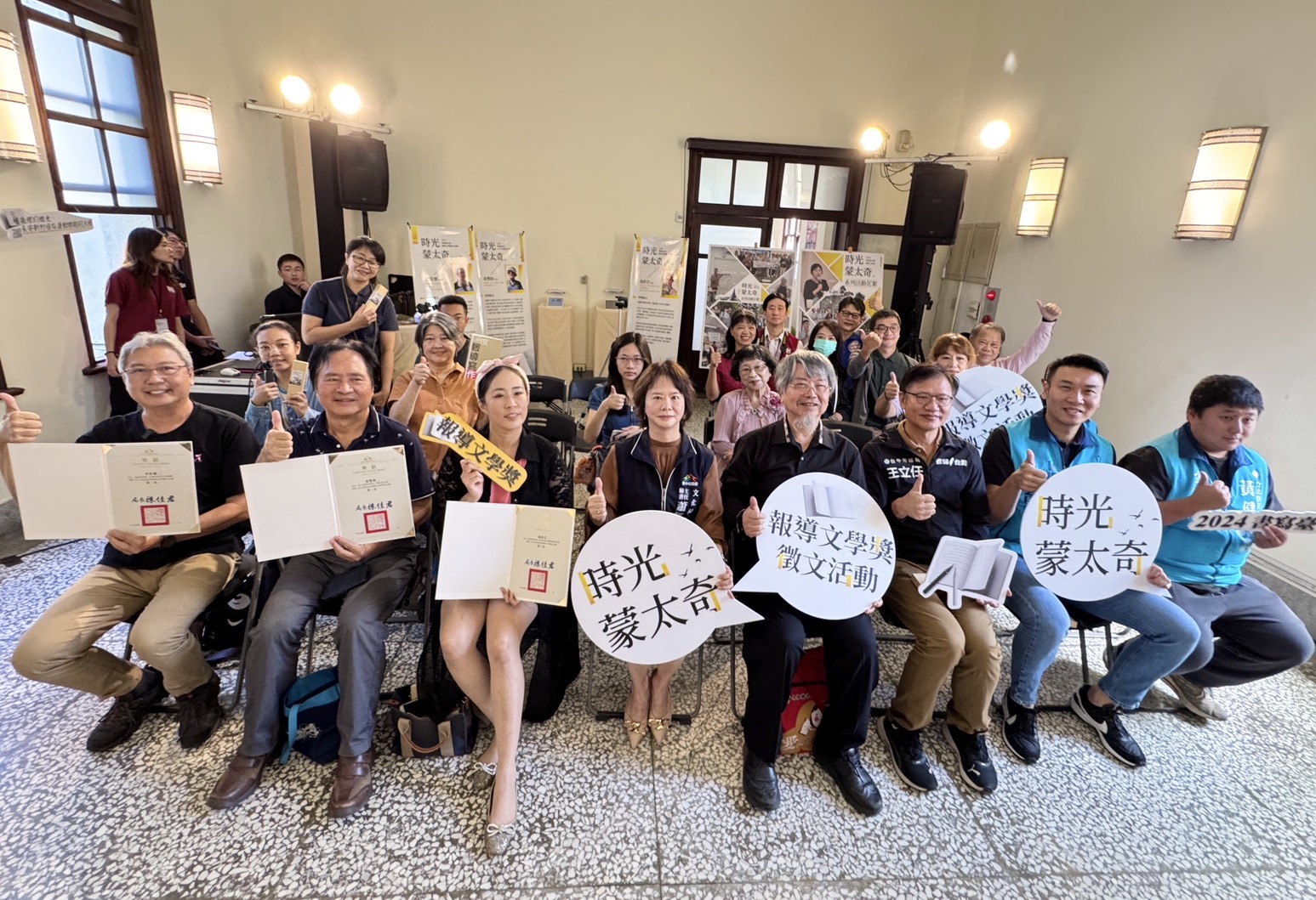 頒獎典禮,右起第一名李佳懷、第二名黃豐隆、第三名張欣芸、文化局主任秘書蕭靜萍、評審委員康原合影、文化局主任秘書蕭靜萍、市議員王立任、評審康原、嶺東科技大學邱一峰老師派代表共襄盛舉。(記者高先鋒攝) 由臺中市政府文化局主辦的「2024書寫臺中城」報導文學徵文比賽,(2)日上午於臺中放送局舉行頒獎典禮,本屆得獎的作品不約而同皆聚焦於文化資產保存,由敘事清晰、觀點鮮明,以北溝故宮為題的李佳懷脫穎而出獲得首獎。