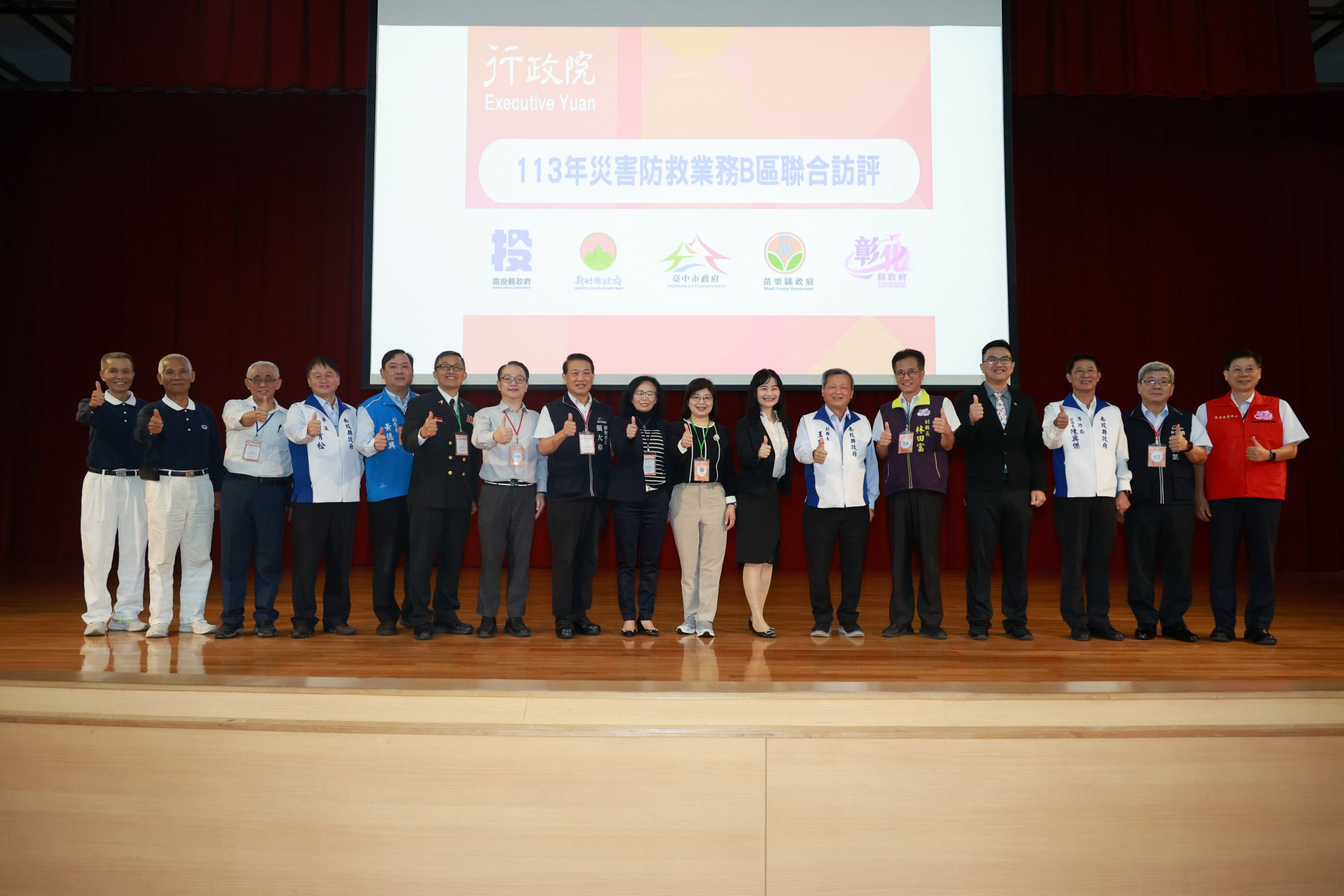 「行政院113年度災害防救業務訪評-B區聯合訪評」今年由南投縣政府擔任主辦縣市,20日在國立暨南國際大學登場,中央評核團隊由行政院災害防救辦公室副主任王怡文帶領行政院率災害防救辦公室、原住民族委員會、國家科學及技術委員會、國防部、內政部民政司、經濟部國營事業管理司等36個相關權責部會(機關)等80多位考評人員出席,由新竹縣、苗栗縣、台中市、彰化縣,及投縣共同接受考評;考評團隊逐一聽取簡報,並進行書面資料審查,就簡報內容及資料整備情形執行評核,受評縣市就各縣市區域特性、災害防救作為及能量,展現其防護韌性,獲中央考評團隊肯定。