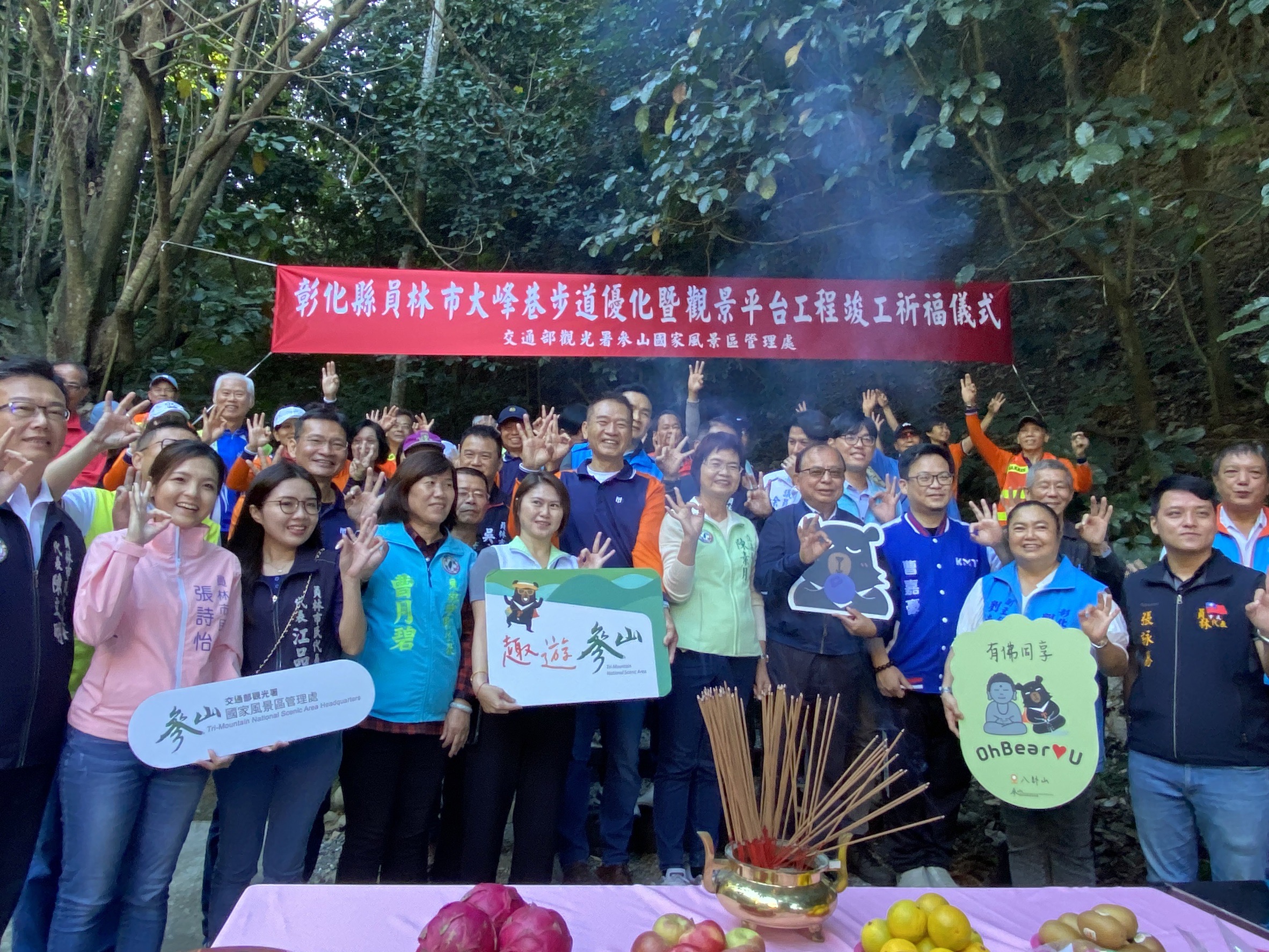 參山處今日上午在大峰巷步道現場舉行竣工祈福儀式,包括立委陳素月、市公所代表、多位縣議員與市民代表、地方里長共同謝土祈福。處長曹忠猷表示,本案工程感謝立法委員陳素月協助爭取經費及市公所全力配合、二輪車隊等地方鄉親無償提供建設用地得以順利建設完成,啟用後將交由市公所維護管理,是中央、地方政府與民間再次攜手合作提供民眾遊憩休閒據點的成功案例。立委陳素月考量步道緊鄰十八觀音步道,希望114年度啟動第二期後續工程,參山處將規劃串接「十八觀音步道」建構更完整的步道系統路網,讓遊客能輕鬆探索、親近八卦山脈的自然景觀與文化魅力。