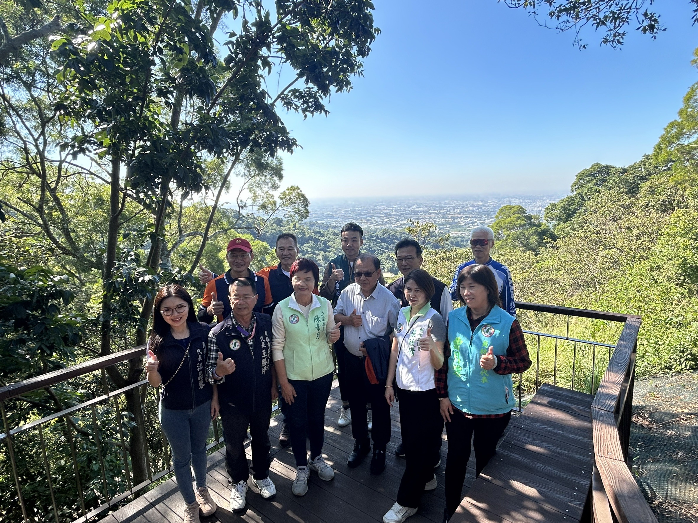 處長曹忠猷(左一)建置八卦山轄區觀光遊憩新據點,今年投入新台幣1,500萬元建設「彰化縣員林市大峰巷步道優化暨觀景平台工程」竣工開放啟用。包括立委陳素月(左四)、市公所代表、多位縣議員與市民代表、地方里長共同謝土祈福。[記者蔡鳳凰攝]