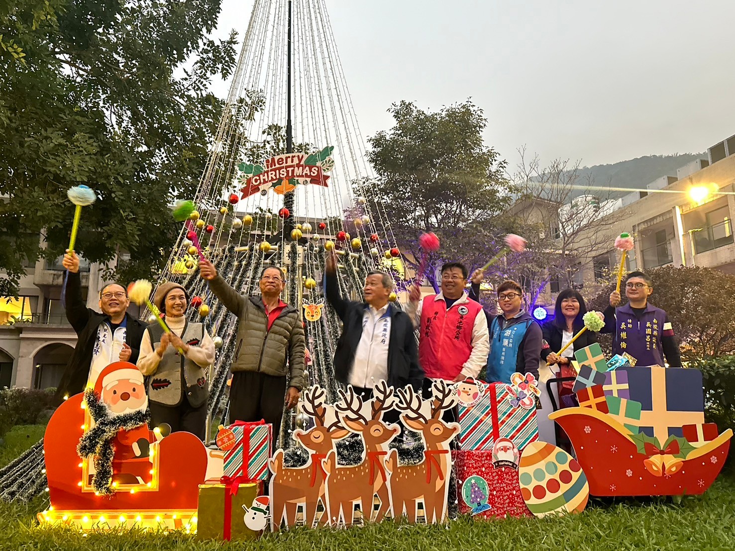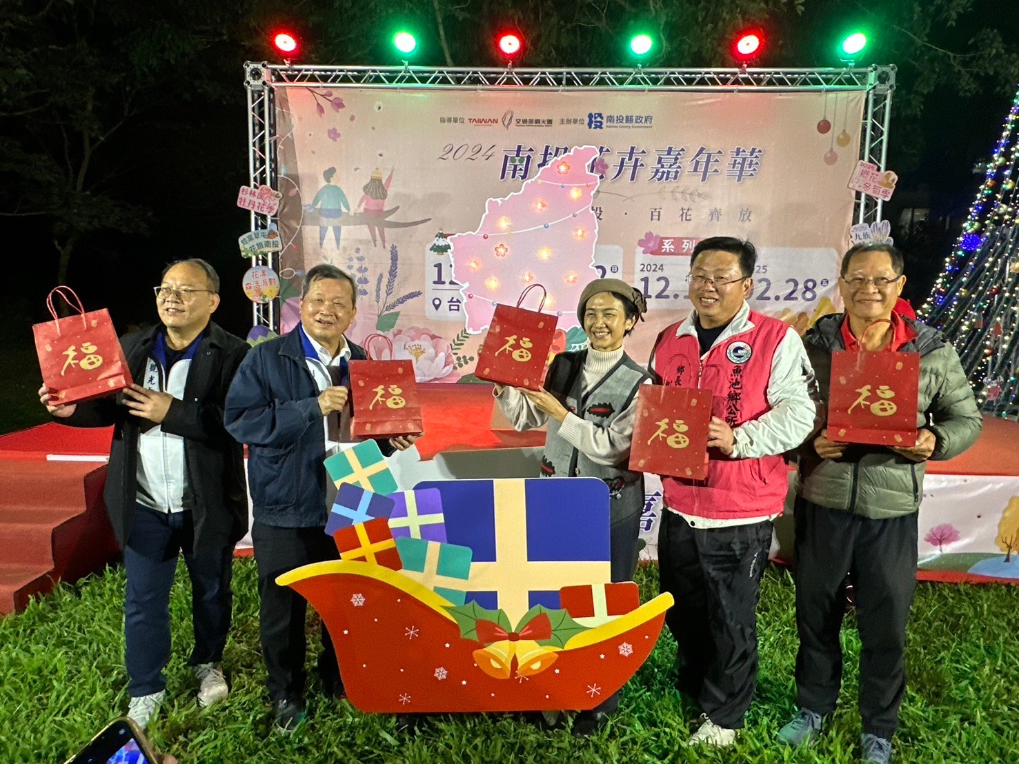 圖說:由副縣長王瑞德(左二)、觀光處長陳志賢(左一)率領各鄉鎮代表一同點亮聖誕樹,象徵南投花季已注入魔法能量,各鄉鎮將遍地開花接力綻放。主題日活動於下午2時開場,在舞台區有絢麗又有趣的泡泡秀、魔幻秀、特技雜耍秀、歌唱演出和有獎徵答活動,在園區的周圍設有花young市集,現場還有彩繪盆栽DIY可以免費參加。(記者梁明善攝)