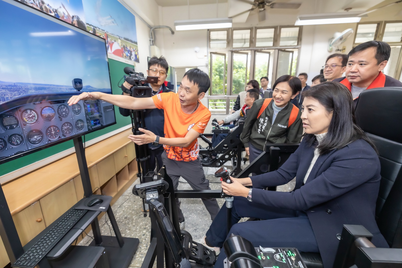 16日下午選手們齊聚一堂,交流與傳承AI無人機的操控技術、運算思維策略、修復機身技術等,並現場進行比賽。選手們看到縣長蒞臨,雀躍不已,紛紛當起小老師,邀請縣長一起操作AI無人機闖關過圈圈,許縣長體驗過後大喊好難,直接手持無人機過圈圈說這樣比較容易,現場哄堂大笑。隨後許縣長也在埔里國中飛行模擬體驗教室體驗飛行模擬器,並與學校討論擴大推廣的可行性。