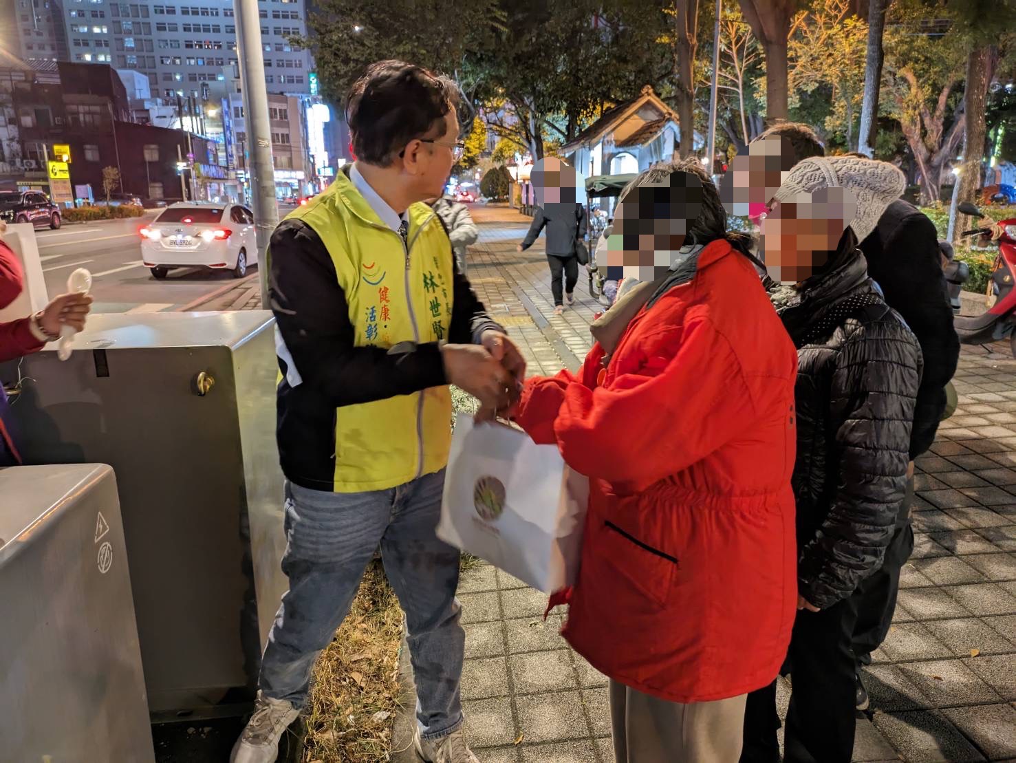 為了關懷及協助街友們能夠度過寒冬,長期關懷弱勢的彰化市長林世賢偕同熱心公益的財團法人彰化縣私立葳群公益慈善事業基金會多名志工,分赴幾處街友聚集地,發放保暖毯等物資與熱食等。[記者蔡鳳凰攝]