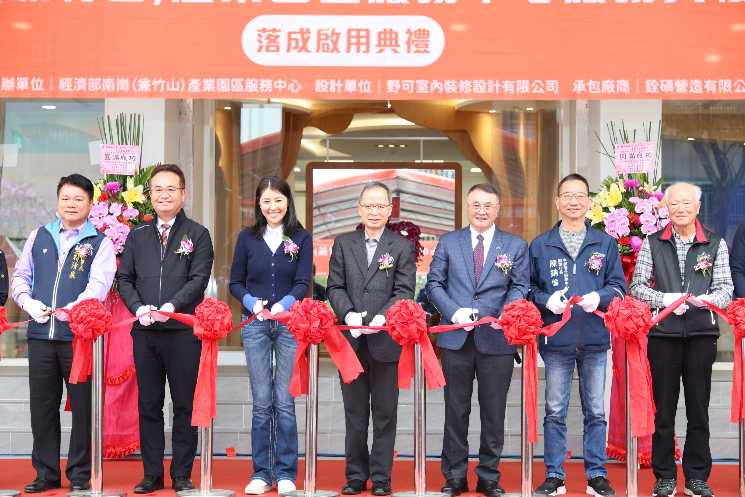 經濟部南崗(兼竹山)產業園區服務中心整建落成,新上任的主任康誌合(右三)主持,在經濟部產業園區管理局臺中分局長紀世宗(中)縣長許淑華(左三)、行政院中辦副執行長陳錦倫(右二)等剪綵見證下啟用。
