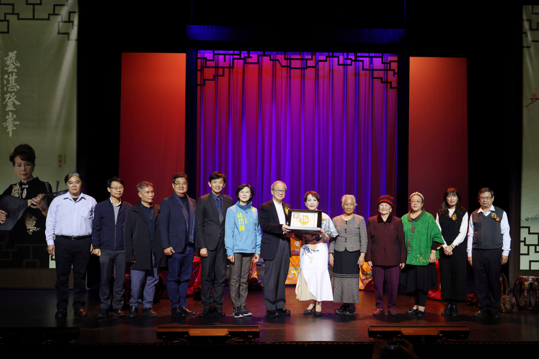 「113年重要傳統表演藝術保存者」授證典禮,文化部長李遠(右七)、新科人間國寶陳嬿朱(右六)、人間國寶許春美(右五)、人間國寶陳英(右四)、人間國寶陳啟村(左四)、人間國寶黃福壽(左三)等合影。(記者梁秀韻攝) 文化部28日辦理「113年重要傳統表演藝術保存者」授證典禮,文化部長李遠親頒授認定證書予南管音樂保存者陳嬿朱藝師,表彰其於南管音樂領域成就。授證典禮開場由「南聲社」帶來《聽見機房》演出,為典禮揭開序幕。立法委員林岱樺、臺南市副市長葉澤山、重要傳統表演藝術「恆春民謠」保存者陳英、重要傳統工藝「排灣族tjemenun傳統織布」保存者許春美、「傳統木雕」保存者陳啓村、「玉雕」保存者黃福壽、「宜蘭本地歌仔」保存團體壯三新涼樂團團長陳漢文、「阿美族馬蘭Macacadaay」保存團體杵音文化藝術團團長高淑娟及陳嬿朱的親友、學生出席。
