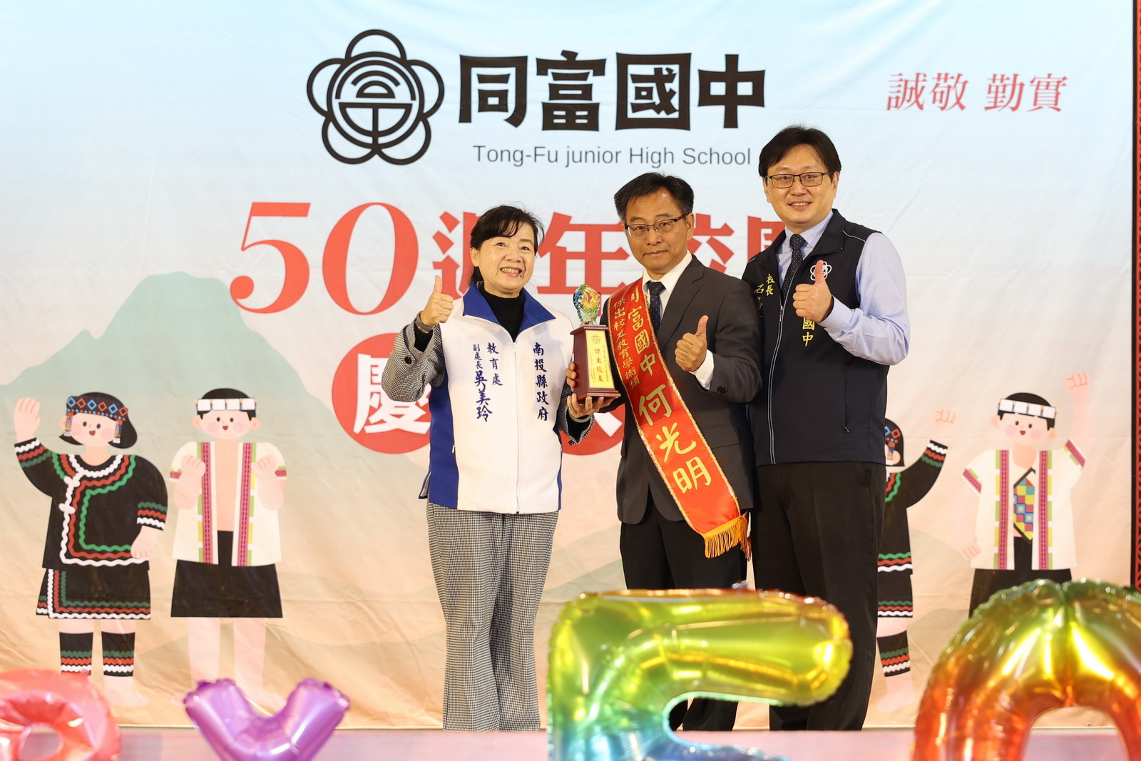 縣府教育處副處長吳美玲(左一)與校長石啟佑一同頒發獎盃給30名在各領域中表現傑出的校友。縣議員全文才、信義鄉長全志堅也出席致意。 [記者蔡鳳凰攝] 信義鄉同富國中以「飛躍50、共創未來」為主軸,28日盛大舉辦建校50週年校慶紀念大會,以園遊會型式邀請歷任校長、會長、退休教師與校友們重聚,分享母校的蛻變與成長,共同回味一同走過的青春,同時表揚30位傑出校友、9位資深教職員以及榮獲「代代同中人獎」的13個家族。