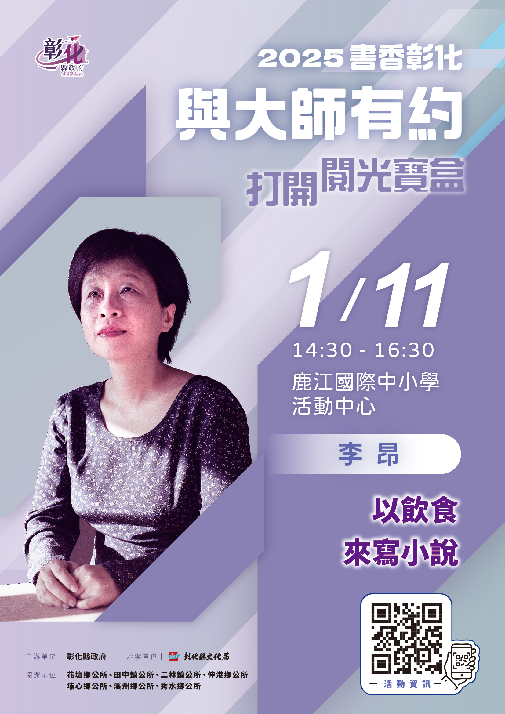 年度第1場專題講座訂於1月11日(星期六)下午2:30在鹿江國際中小學活動中心舉行,出身彰化鹿港的世界級文學大師李昂將以「以飲食來寫小說」為題,李昂不僅是彰化的驕傲,更是台灣文化的一面旗幟 。(記者梁添義攝) 彰化縣文化局2025「書香彰化-與大師有約」透過不同領域重量級作家的專業及影響力,引領民眾廣泛閱讀,將書香帶入生活,讓民眾猶如打開閱光寶盒,從此獲得知識的寶藏!年度第1場專題講座訂於1月11日(星期六)下午2:30在鹿江國際中小學活動中心舉行,出身彰化鹿港的世界級文學大師李昂將以「以飲食來寫小說」為題,分享多年來追逐美食的契機,以及美食如何深刻影響自己的文學創作,內容精彩,歡迎大家踴躍前往聆聽。