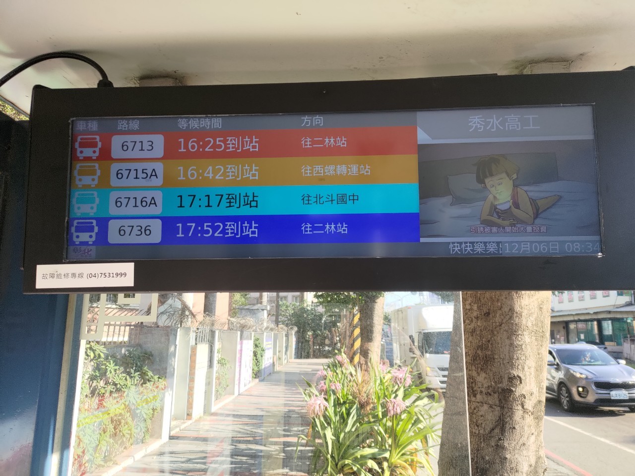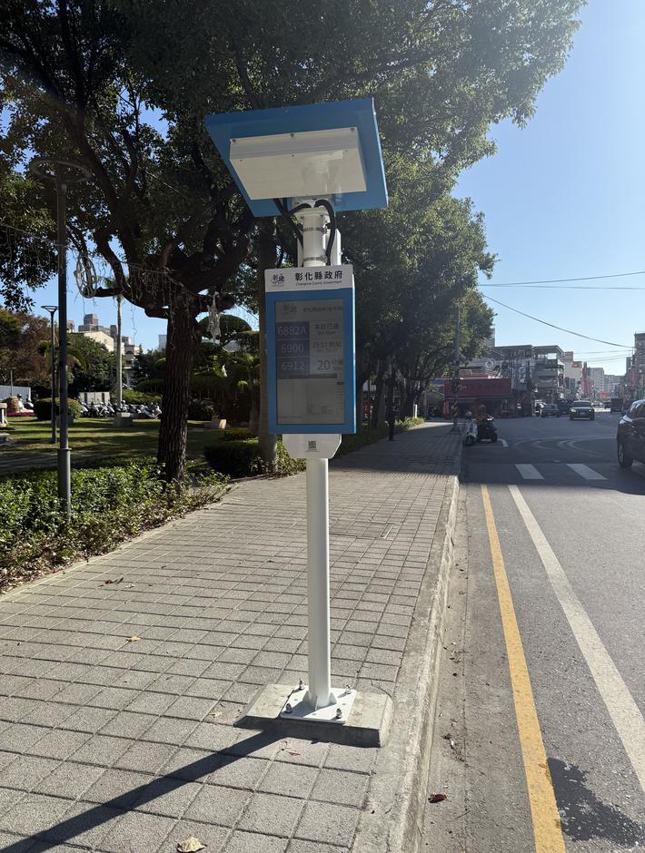 縣府積極推動「幸福候車計畫」,斥資2,565萬8,800元汰換縣內共計120座智慧站牌,包括附掛式智慧站牌37座及獨立式太陽能電子紙節能式站牌83座,已全數於113年12月27日完成驗收並正式啟用,彰化縣長王惠美期望提供民眾更安全、舒適的候車環境以及公車預估到站時間資訊。(記者蔡鳳凰攝) 為提升公車服務水準,縣府積極推動「幸福候車計畫」,斥資2,565萬8,800元汰換縣內共計120座智慧站牌,包括附掛式智慧站牌37座及獨立式太陽能電子紙節能式站牌83座,已全數於113年12月27日完成驗收並正式啟用,彰化縣長王惠美期望提供民眾更安全、舒適的候車環境以及公車預估到站時間資訊,減少民眾候車時間,提升公共運輸服務品質。