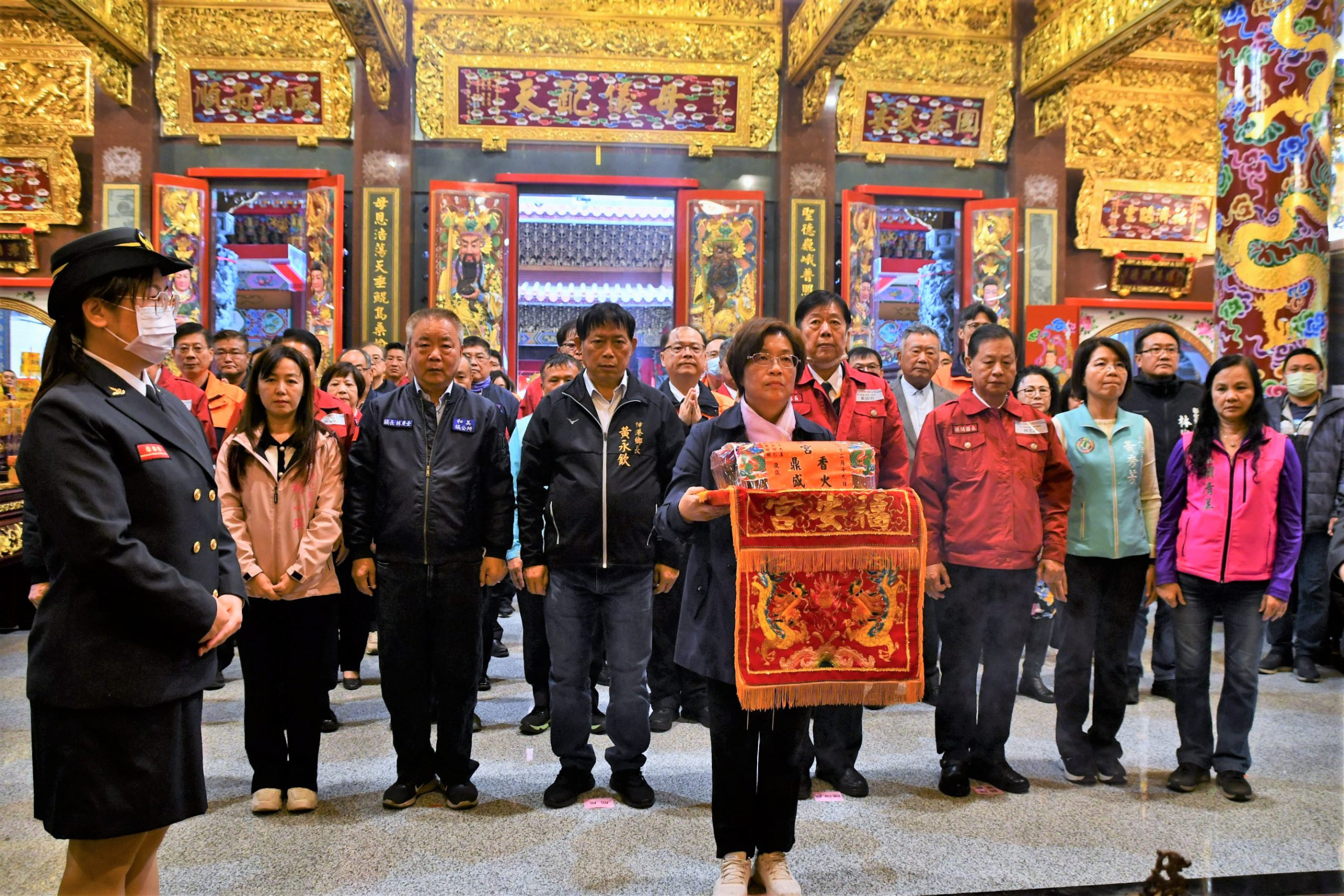 圖說:由縣長王惠美(中)主持,率領眾消防幹部一同於福安宮進行祈福儀式,祈求風調雨順、國泰民安,並頒獎表揚具消防工作榮譽的績優獎牌予彰縣績優消防、義消、防火宣導人員及救難團體志工有功人員,共13個獎項,189人與會貴賓有立委黃秀芳、縣議員林小琪、賴清美、蕭文雄、林宗翰、伸港鄉長黃永欽、和美鎮長林庚壬、線西鄉民代表會主席王水波、福安宮主委曾添進、線西鄉農會理事長楊玲珠、總幹事王嘉琪、彰化縣消防局長施順仁、各級民代與地方仕紳等。(記者蔡鳳凰攝)