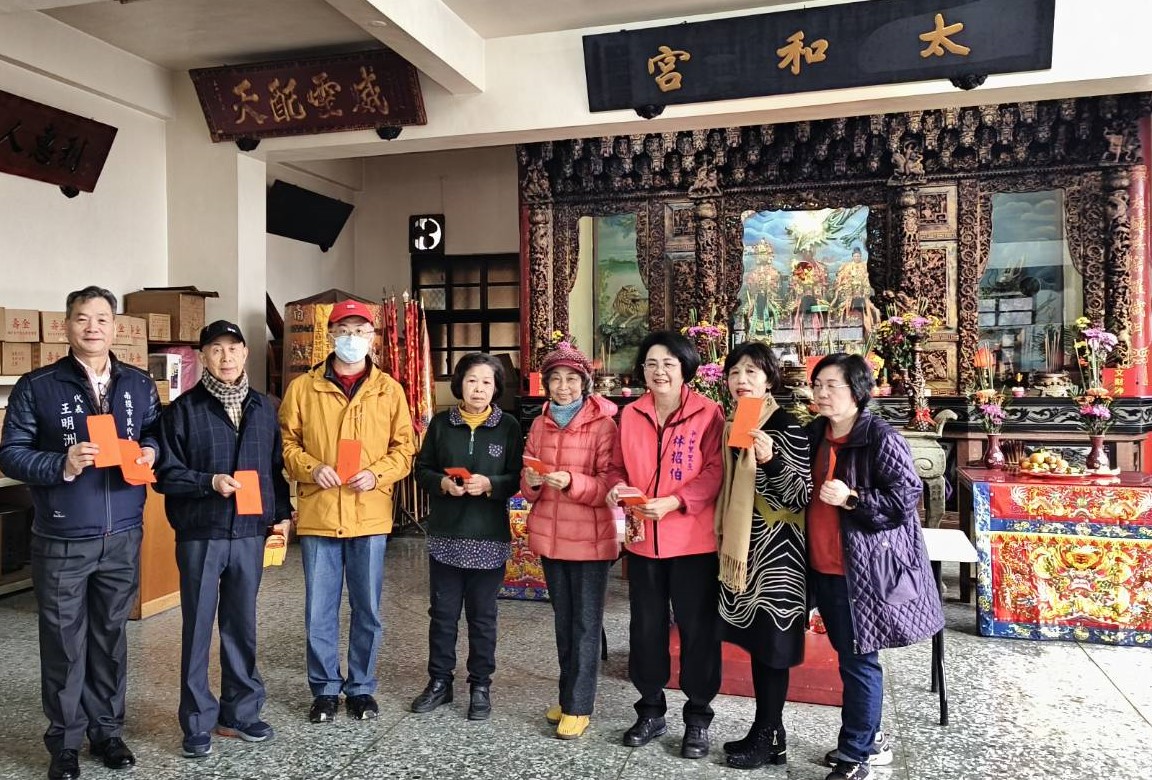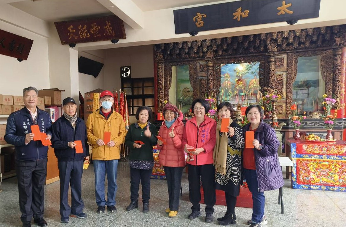 南投平和里長林招伯(圖右3),蛇年的大年初一,特別到太和宮祈福,也向前來參拜的里民和信眾發送紅包,她的紅包有別於縣長和市長的一元、十元,印有太和宮發財禮金的紅包裡,裝著可是嶄新的紅色百元大鈔!