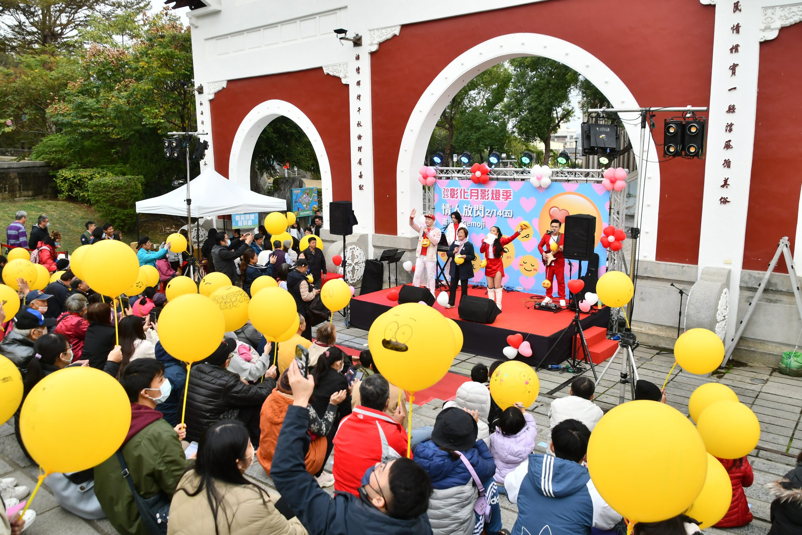 2025彰化月影燈季系列活動-情人放閃,「畫出emoji 情人齊放閃」於今天(2/14)西洋情人節傍晚,由彰化縣長王惠美及現場520對情人在八卦山大佛風景區參佛道階梯,公開放閃,在黃色氣球上創作自己的emoji,畫出代表現在心情的表情,互相表白心意,當日也發放1040個特別版愛心emoji小提燈,還有超級大咖樂團現場演唱,度過一個難忘的情人節。